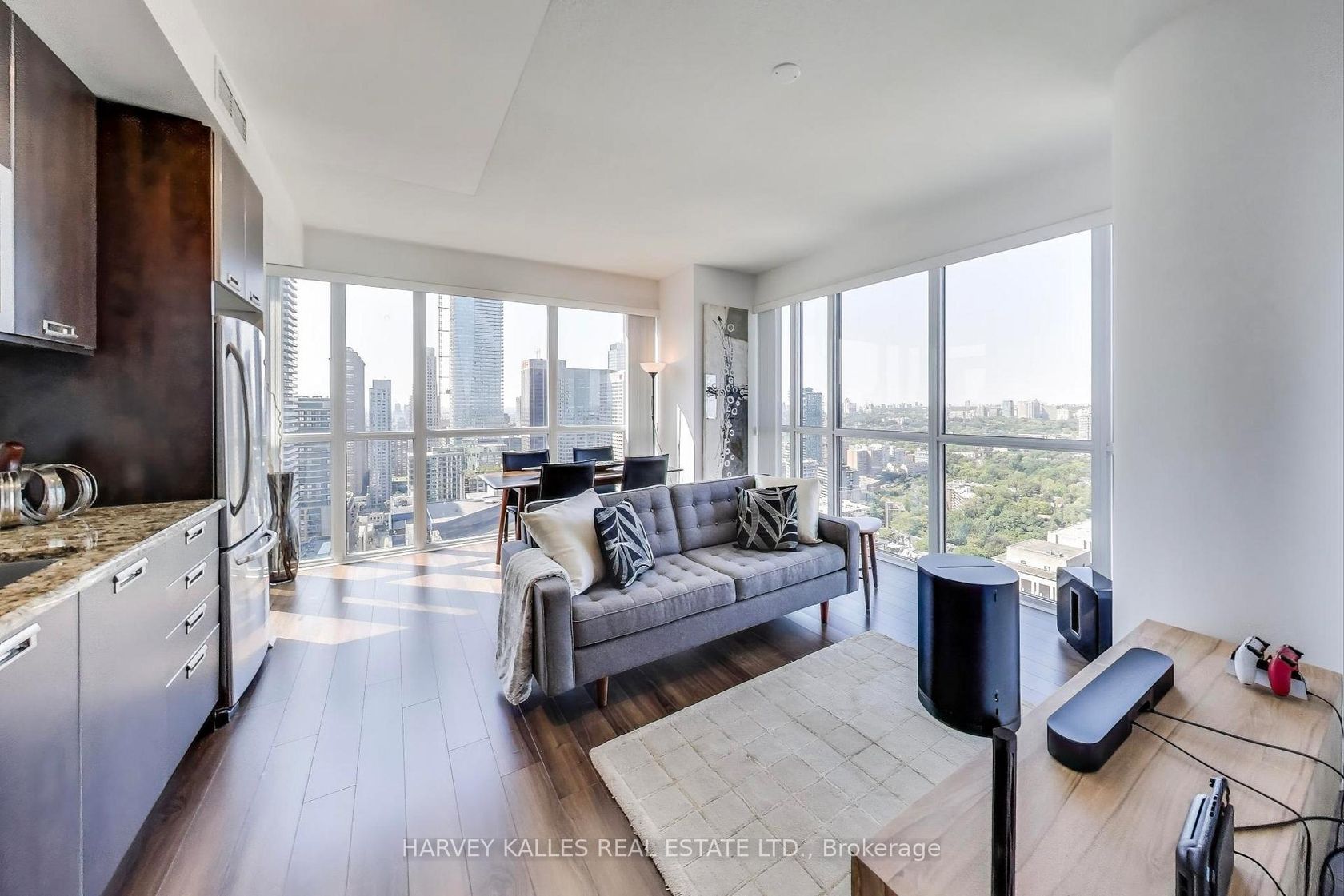 Perched on the 36th floor of Couture Condominius at 28 Ted Rogers Way, this two-bedroom corner unit treasure blends modern design with sweeping northwest views of Toronto's skyline and the lush green canopy to the North. Through soaring 9-foot ceilings and floor-to-ceiling windows, every evening brings a breathtaking show of golden sunsets and sparkling city lights. Inside the efficient open-concept layout feels bright and airy, perfect for both quiet nights and lively gatherings. The sleek kitchen finished with stainless steel appliances, granite counters, and comtemporary cabinetry flows seamlessly into the living and dining areas, creating a space that's a functional as it is inviting. Both bedrooms are thoughtfully sized, offering fexibility for a home office or guest room, while the spa-inspired bath and in-suite laundry add everyday ease. Located a few minutes walk from Yonge & Bloor, with the subway, boutiques, fine dining, and cultural hotspots at your doorstep, this residence pairs vibrant city energy with a peacful perch above it all. With world-class amenities including 24-hour concierge, a stylish party lounge, fitness centre, and indoor pool, Unit 3609 makes luxury living refreshingly attainable and affordable. Come home to spectacular sunsets, modern comfort, and the best of midtown Toronto living.