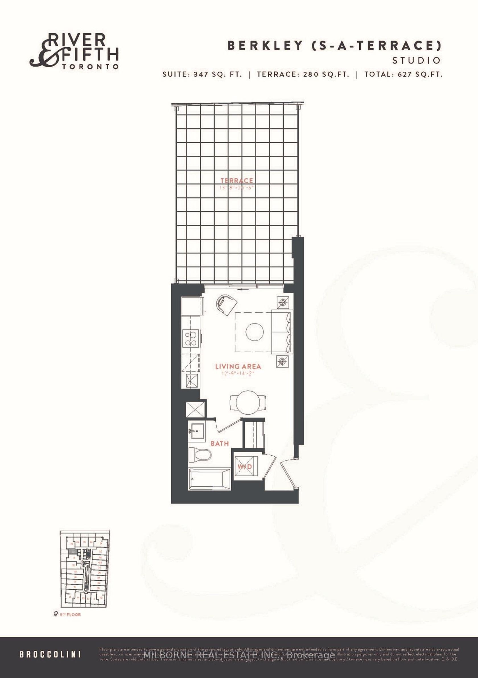 Welcome To River & Fifth By Broccolini. Located In The Heart Of Torontos Downtown East And Well Situated Near Dundas & Queen East - Close To Dvp, Transit, Dinning & More. Building Amenities Include Concierge, Gym, outdoor pool, Party Room, Visitor Parking & More! Studio Unit Features Living space, 1 Bath W/ Terrace. West Exposure. Laminate Flooring Throughout. B/I Appliances: Fridge, Stove, Hood Fan, Microwave, Dishwasher. Washer & Dryer.