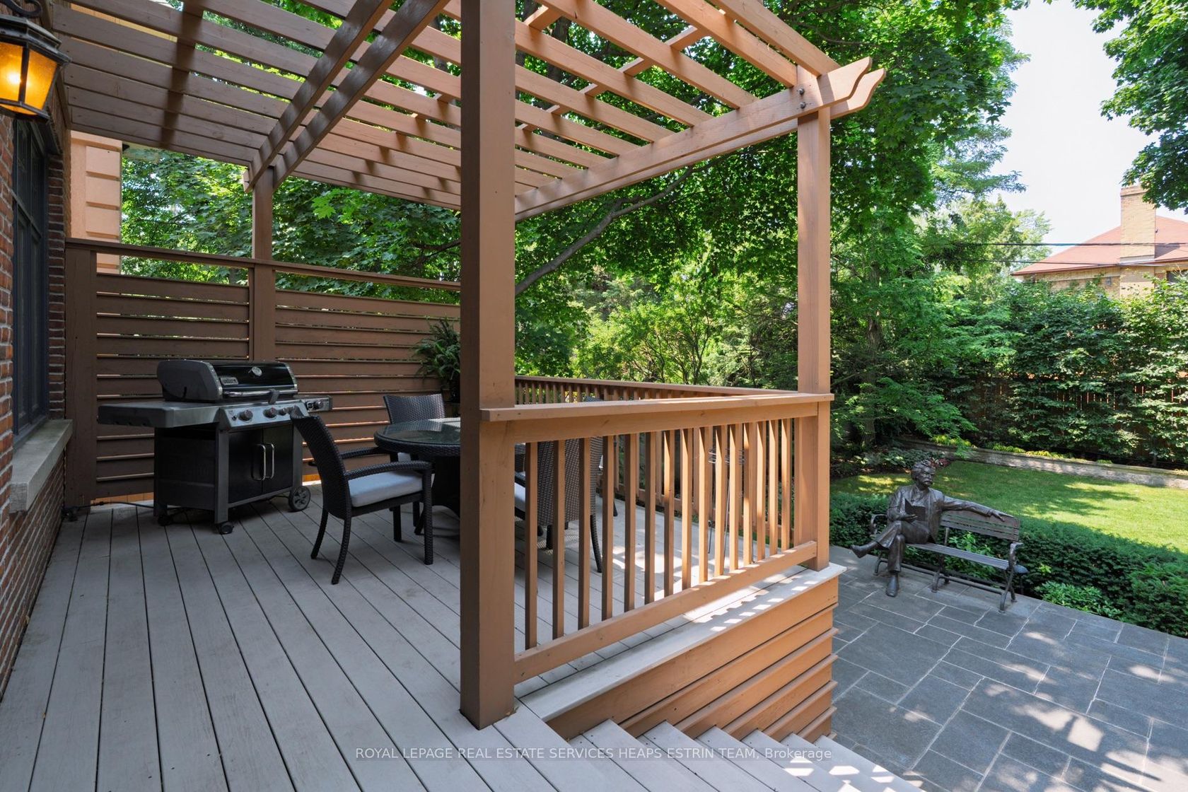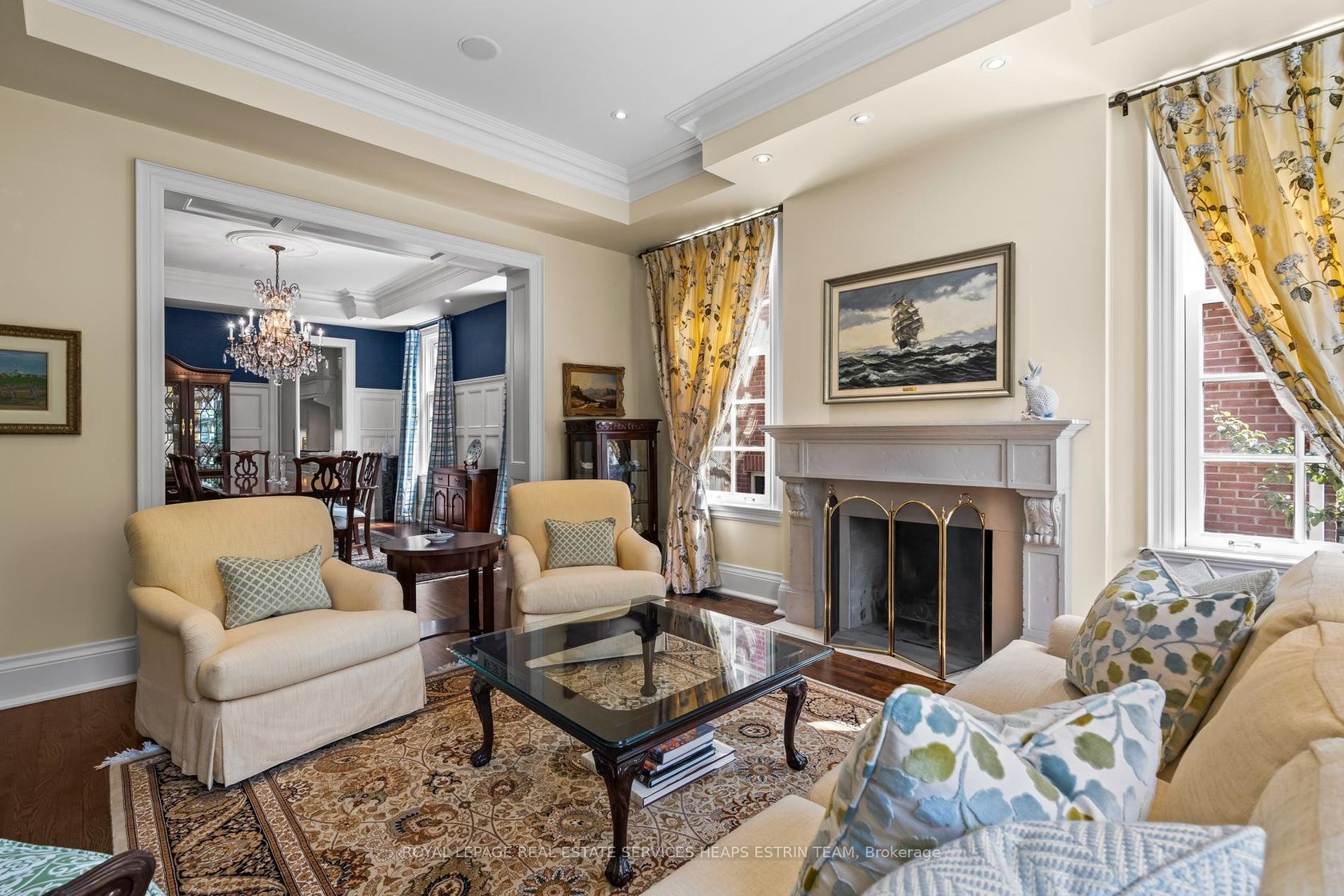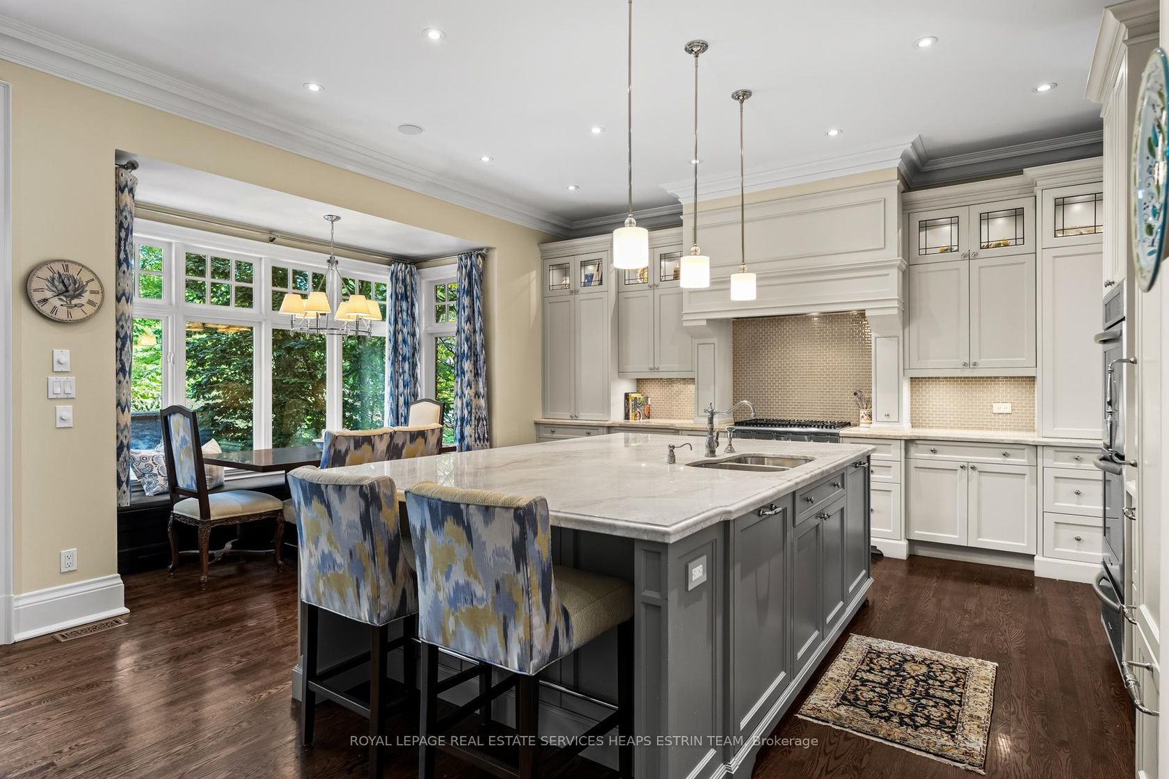 Tucked away in Lawrence Park, 260 St Leonard's Avenue is a Georgian-inspired home blending classic architecture with a touch of modern style across 6,000 square feet and three levels. Inside, the atmosphere is welcoming and bright, with sunlight pouring through the foyer and highlighting custom millwork. There's a private office for focused work, and the living room, anchored by a wood-burning fireplace, is made for cozy evenings. The dining room features stained glass windows and custom wainscotting and overlooks the living room. At the heart of the home is the kitchen: a marble-topped island, custom cabinetry, and high-end appliances. Sunlight fills the breakfast nook, while the family room, complete with a gas fireplace and a wall of windows blends seamlessly with the outdoors. French doors lead to a deck perfect for barbecues, with a stone patio and gas fireplace surrounded by gardens for total privacy. This backyard is made for gatherings, alfresco dinners, and unforgettable summer nights. Practical spaces get equal attention: a designer powder room, main-floor laundry with built-in storage, and a bar area for entertaining complete the main floor. Upstairs, the primary suite is a true retreat with vaulted ceilings, a custom dressing room, and a spa-like ensuite featuring a waterfall shower and dual marble vanities. Three additional bedrooms are sunlit and spacious, each with custom double closets. The lower level is designed for fun; think recreation room with fireplace, gym, guest/nanny suite with ensuite bath, flex space, access to the garage, and a climate-controlled wine cellar. The location is unbeatable: tree-lined St. Leonards Avenue offers easy access to trails, top private schools, and the Granite Club. This is a home that balances sophistication with everyday comfort and room to grow.