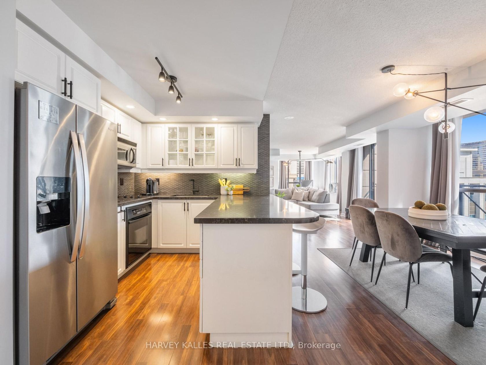 Step into nearly 1,200 sq. ft. of sun-filled living in this rare 2+1 bedroom, 2 bathroom corner suite with North, East, and South-East exposures. Flooded with natural light from multiple directions and framed by two private balconies, this home offers both space and sophistication that are hard to come by in the downtown core. The primary retreat boasts a spacious walk-in closet and a 5-piece spa-inspired ensuite true sanctuary in the city. The second bedroom, equally generous with its large window and closet, connects seamlessly to the family bathroom, making it ideal as a guest room, home office, or both. At the heart of the home, the renovated 2020 kitchen combines style and function with stainless steel appliances, a full-sized island with seating for four, and modern lighting throughout. The thoughtful front entryway features double closets, a laundry area, and extra storage are conveniences in condo living. Freshly painted and move-in ready, this suite includes parking and a locker, completing the package. All this in a prime downtown location steps from theatres, restaurants, shopping, and transit. 140 Simcoe offers both the energy of the city and the quiet of a residential enclave. March 2020-Kitchen renovation - new fridge, new counter tops, and new back splash, new washer/Dryer. August 2024-Painted full unit. August 2025-Baseboards painted. 2021 or 2022 lobby of building renovated. May 2025 Hallway renovations