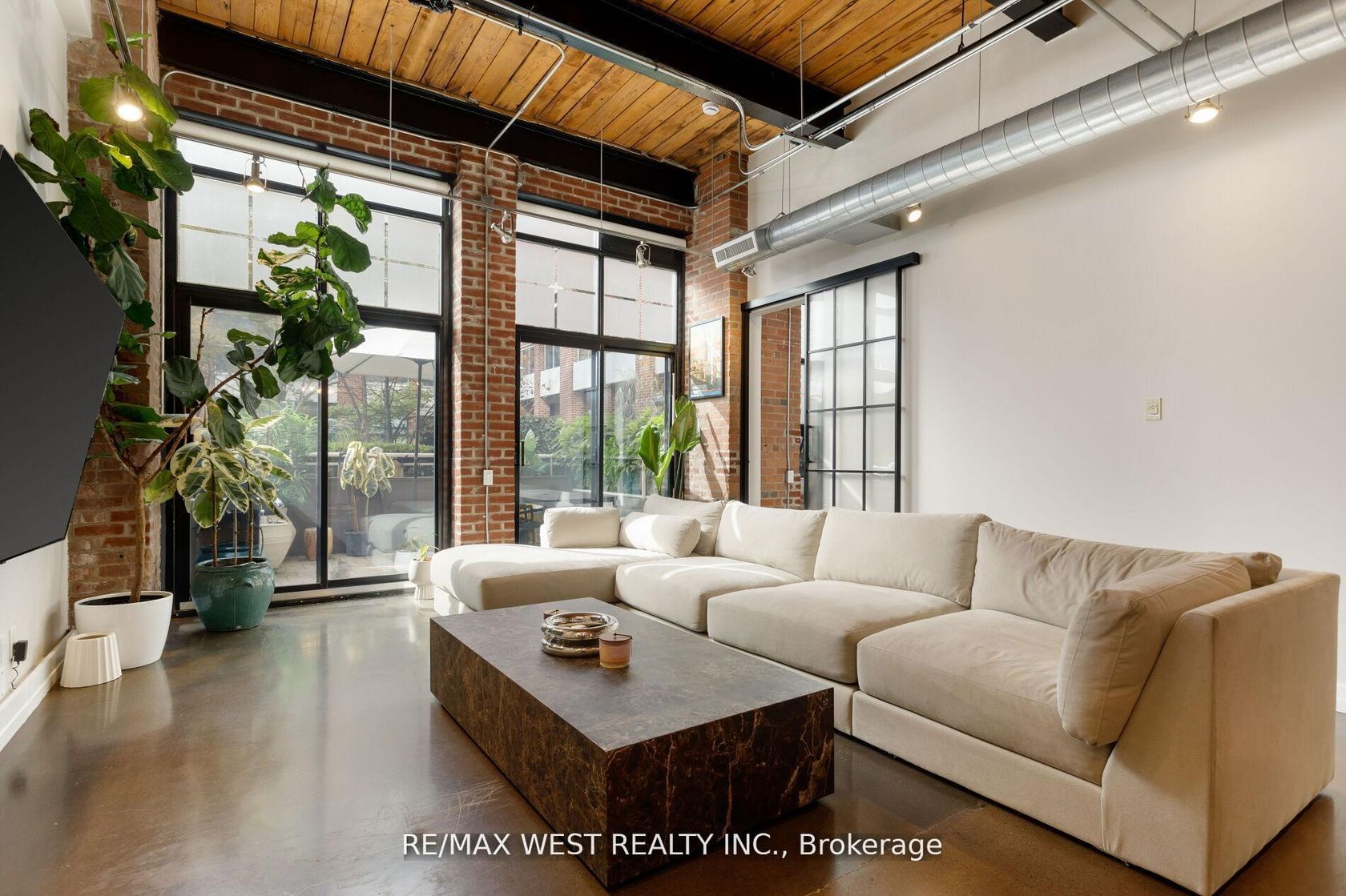 Experience unparalleled sophistication in this custom-crafted hard loft, a rare gem nestled within the historic Irwin Toy Factory in the heart of Liberty Village - one of Toronto's most vibrant and sought-after neighborhood's. Offering approximately 1,475 square feet of interior elegance and a 191-square-foot private terrace, this residence perfectly balances expansive open-concept living with intimate outdoor retreat. Step inside and be captivated by the loft's 13-foot Douglas Fir beamed ceilings, exposed brick walls, and beautifully restored concrete floors - a seamless fusion of industrial heritage and modern refinement. Every detail has been thoughtfully curated to blend timeless character with contemporary luxury. The chef-inspired kitchen is a culinary showpiece, featuring top-of-the-line Sub-Zero and Miele appliances, a Frigidaire gallery induction cooktop, Scavolini white gloss cabinetry, and exquisite marble countertops with a waterfall island and built-in wine fridge. A separate storage/pantry room and dedicated laundry room with custom built-ins ensure both practicality and sophistication. The upgraded bathroom exudes European elegance with Italian ceramic finishes, while Komandor custom closets, including a walk-in closet, provide elevated organization throughout. Upgraded mirrored sliding storage doors further enhance the home's architectural flow and style. Enjoy the comfort of automated window blinds, offering ambiance and privacy at your fingertips, and the convenience of an extra-large parking space that accommodates two vehicles with ease.
