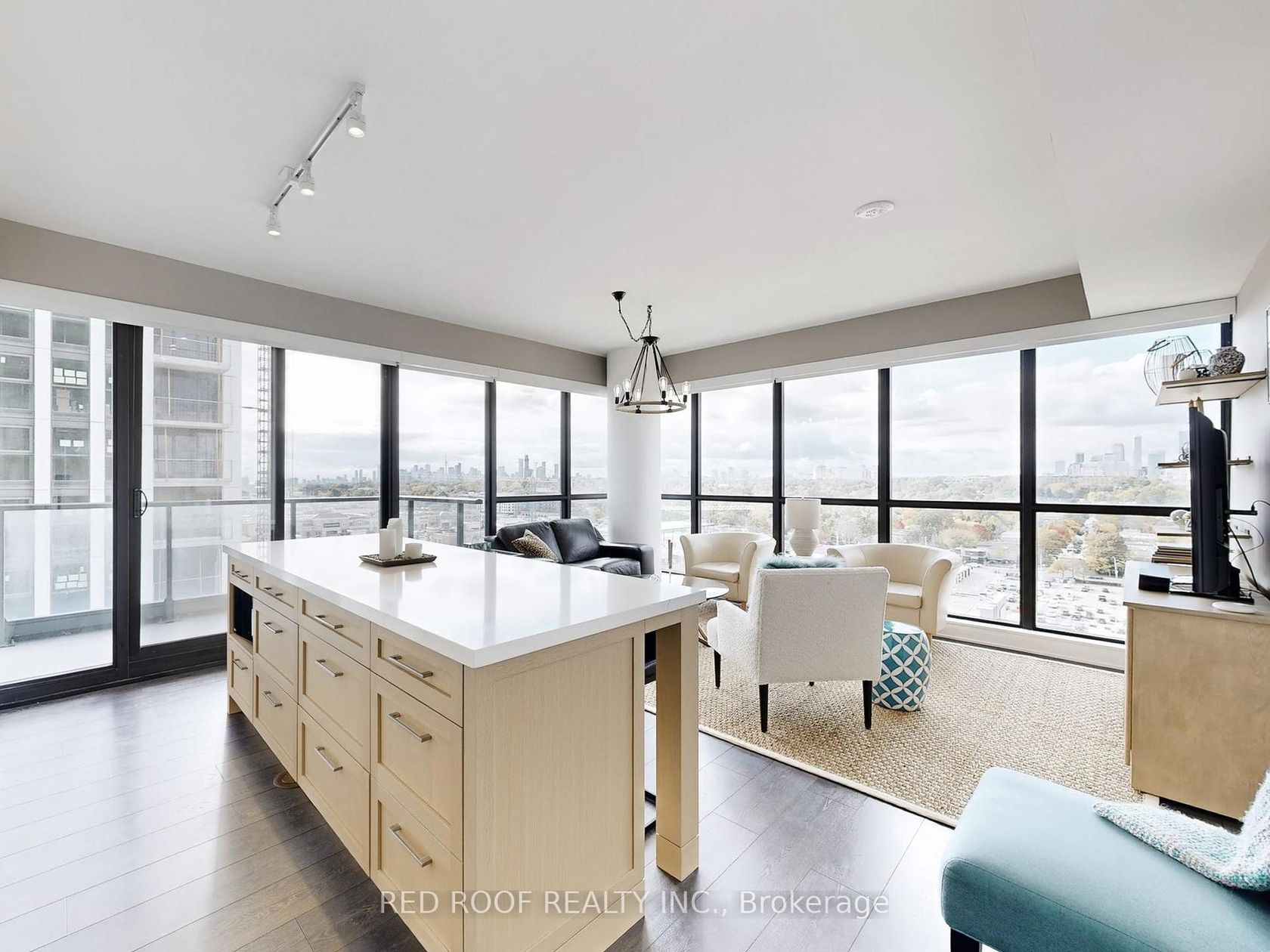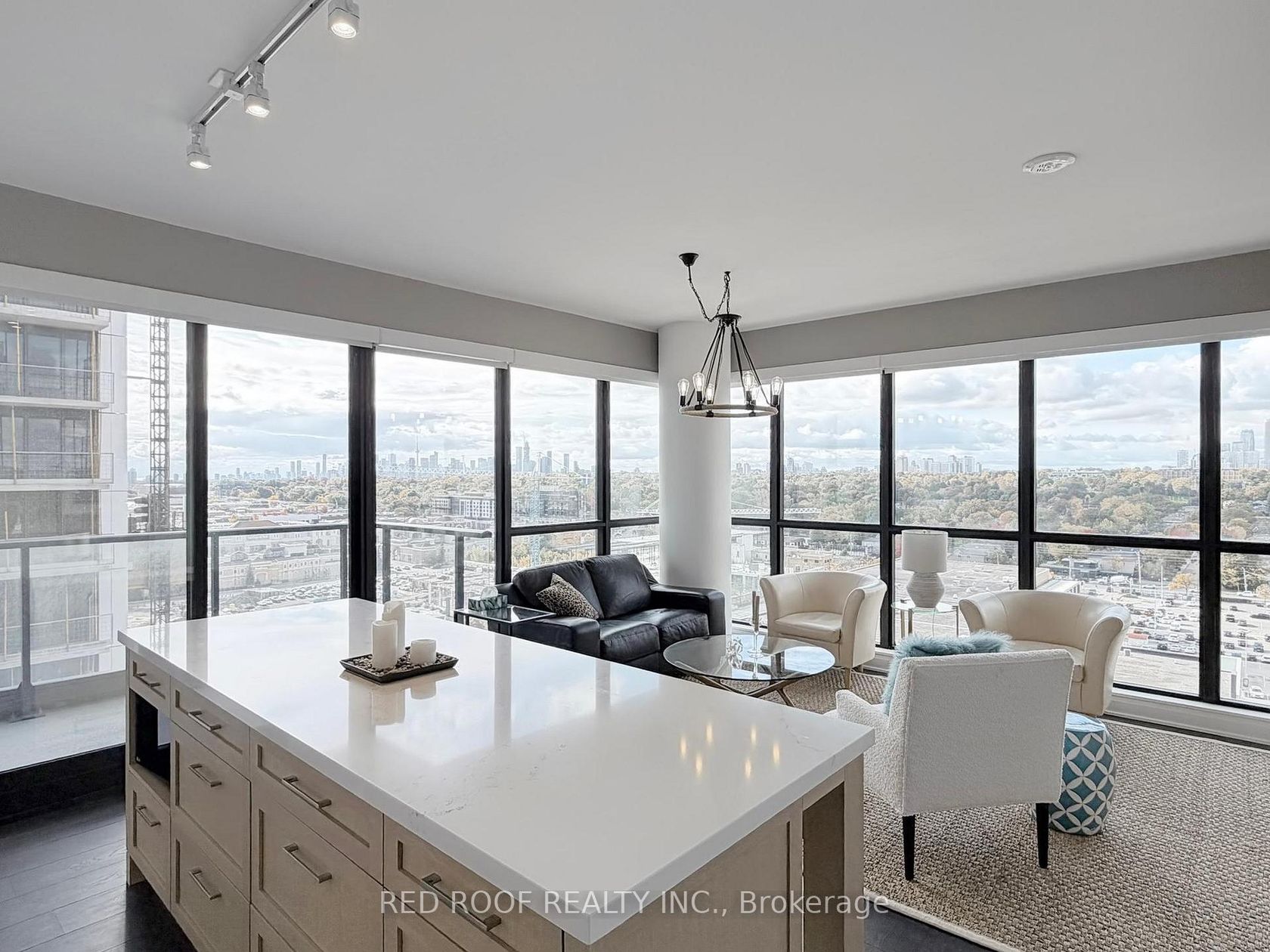 Experience Luxury Living in the Heart of Leaside! Welcome to this bright and spacious open-concept suite featuring soaring 9-ft ceilings, a stunning 8ft Custom Oak island and expansive windows that fill the space with natural light. Open your motorized Hunter Douglas blinds and enjoy unobstructed views of the CN Tower and the stunning city skyline from the comfort of your 915 square foot condo, with two balconies, including an oversized terrace overlooking the city skyline. Located in the prestigious Leaside community, this residence offers the perfect balance of upscale tranquility and urban convenience. Steps to transit, LRT, minutes to the DVP and just outside the busy downtown core. Surrounded by shopping, dining, and green spaces. This thoughtfully designed unit includes parking and a locker, and is situated in a secure, well-managed building offering exceptional amenities, including a well appointed fitness centre, indoor pool, sauna, outdoor lounge with BBQs, 24-hour security, and concierge services. Perfect for young professionals, downsizers, or executives seeking a sophisticated lifestyle in one of Toronto's most desirable and vibrant neighbourhoods. EXTRAS** In the district for Rolph Rd PS, Bessborough Middle School and Leaside High School, some of Toronto's highest ranked schools!