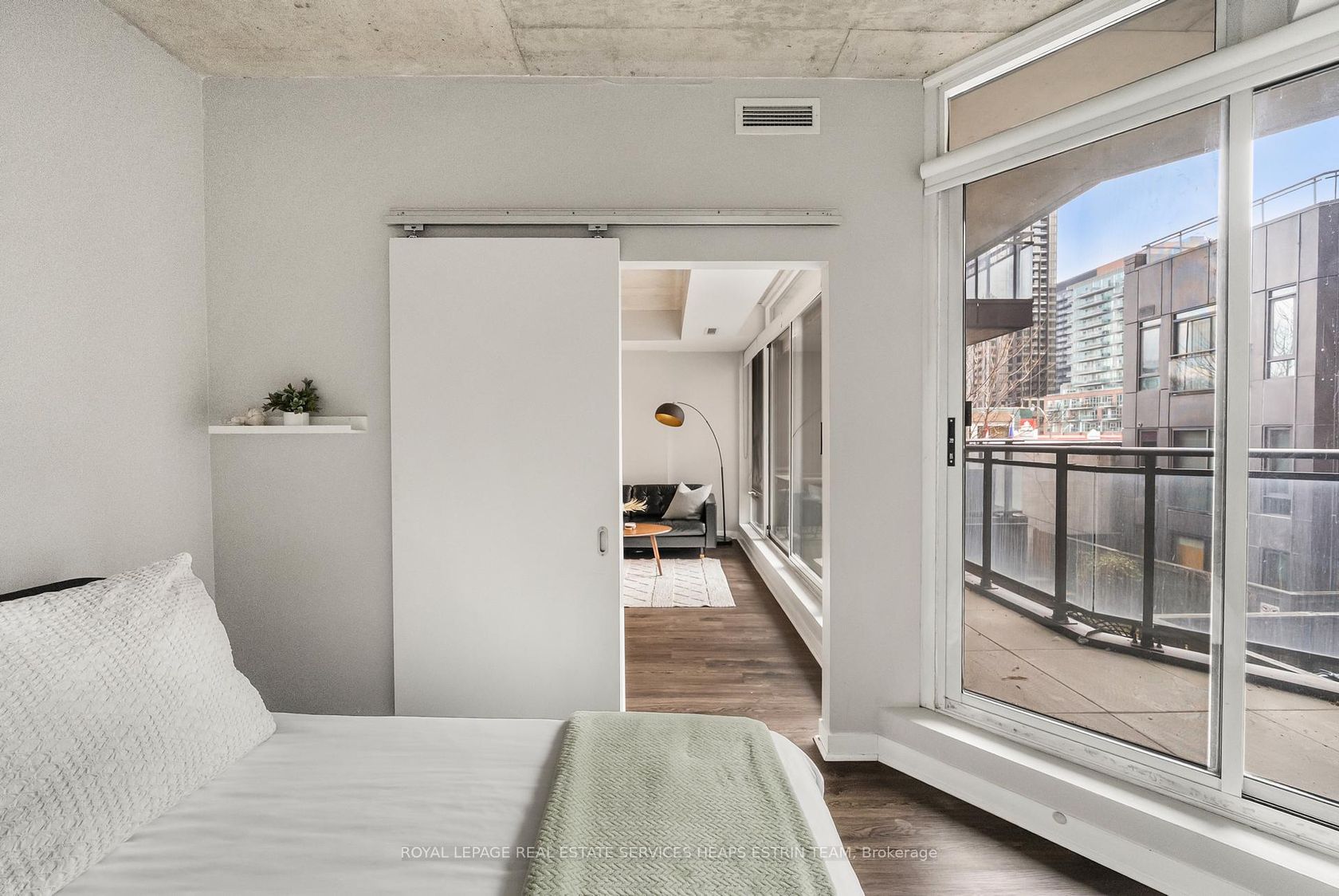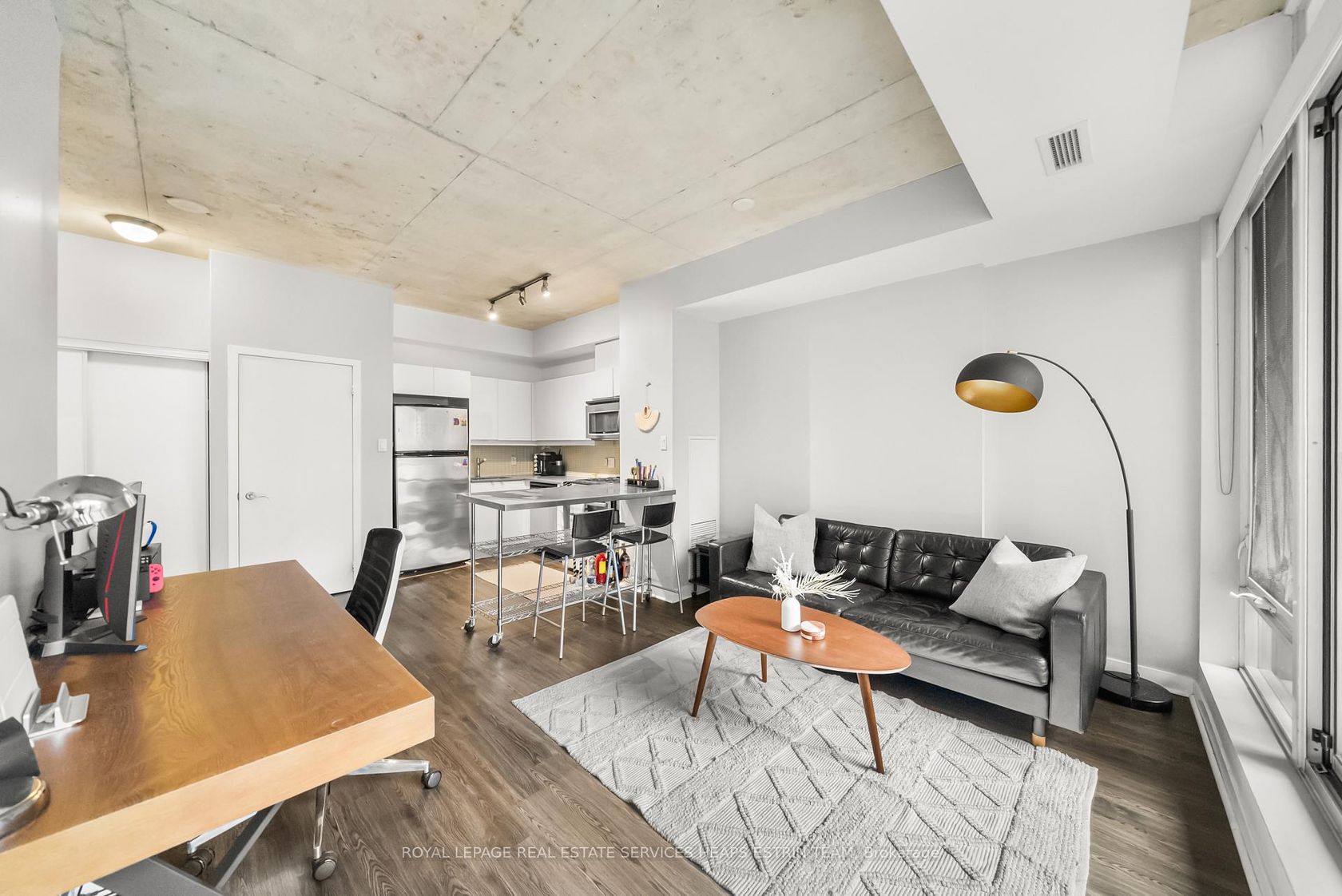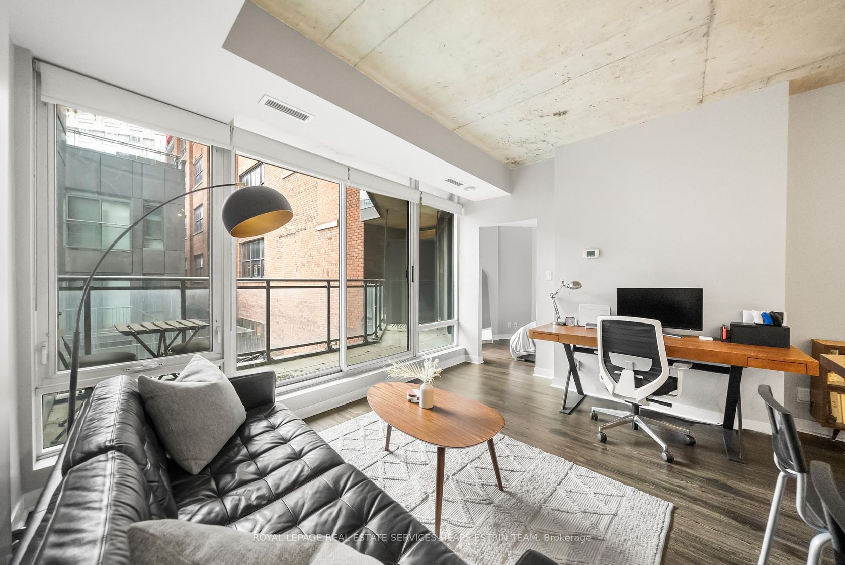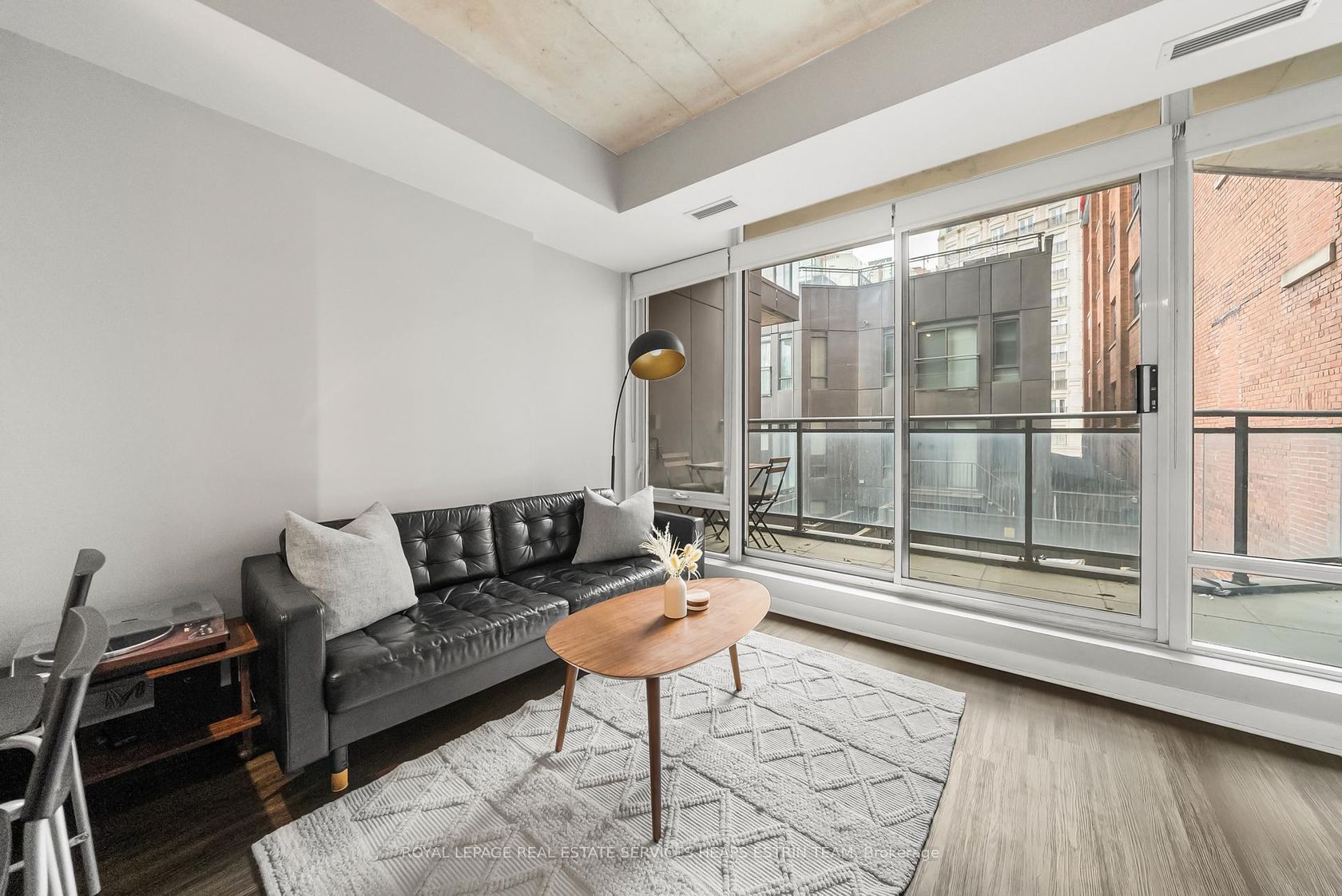 This corner one-bedroom at Glass House Lofts delivers natural light, smart flow, and a vibe that's equal parts refined and relaxed. Perched above Queen and Jarvis in a contemporary boutique building, the suite offers south-facing views framed by floor-to-ceiling windows and an expansive wraparound balcony, complete with a gas BBQ hookup for effortless entertaining. Inside, polished concrete ceilings and a monochrome palette create a sleek, modern backdrop. The open-concept kitchen features full-sized stainless steel appliances and crisp cabinetry. But it's the layout that sets this one apart: a floor plan that works. Intuitive, spacious, and surprisingly flexible. The bedroom includes a generous closet, while an oversized entryway closet adds a rare layer of storage. Tucked into the heart of downtown yet removed from the noise, you're steps to the St. Lawrence Market, St. James Park, the Financial District, and Queen East's cultural core. Clean design. Smart living. Zero compromise.