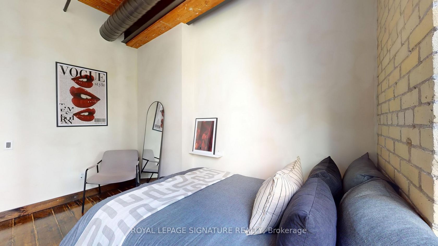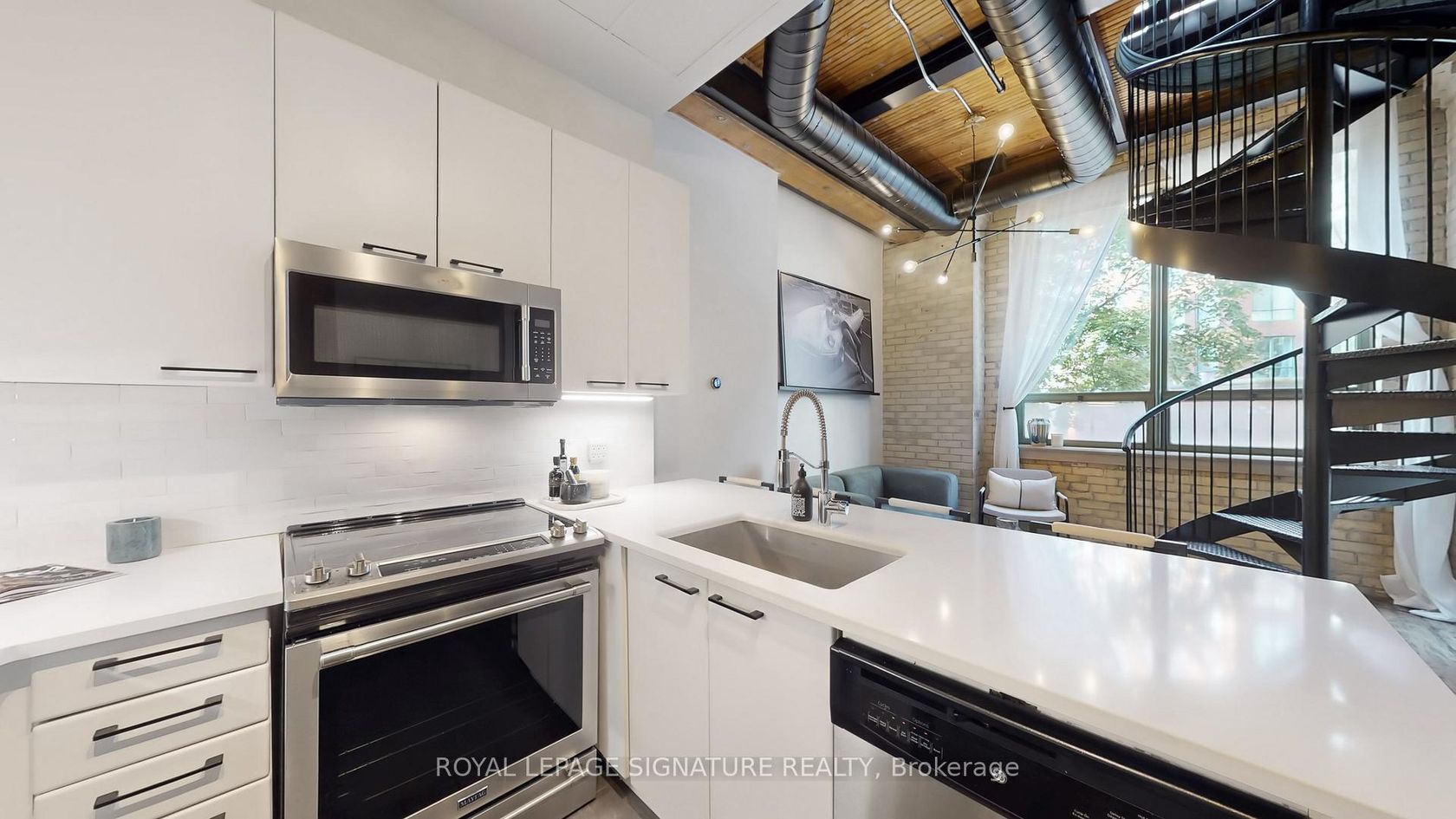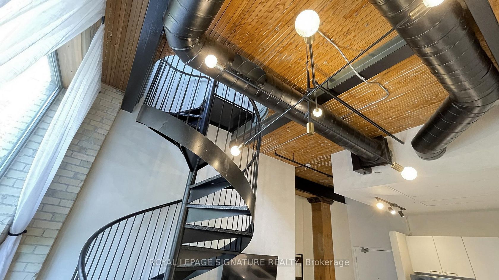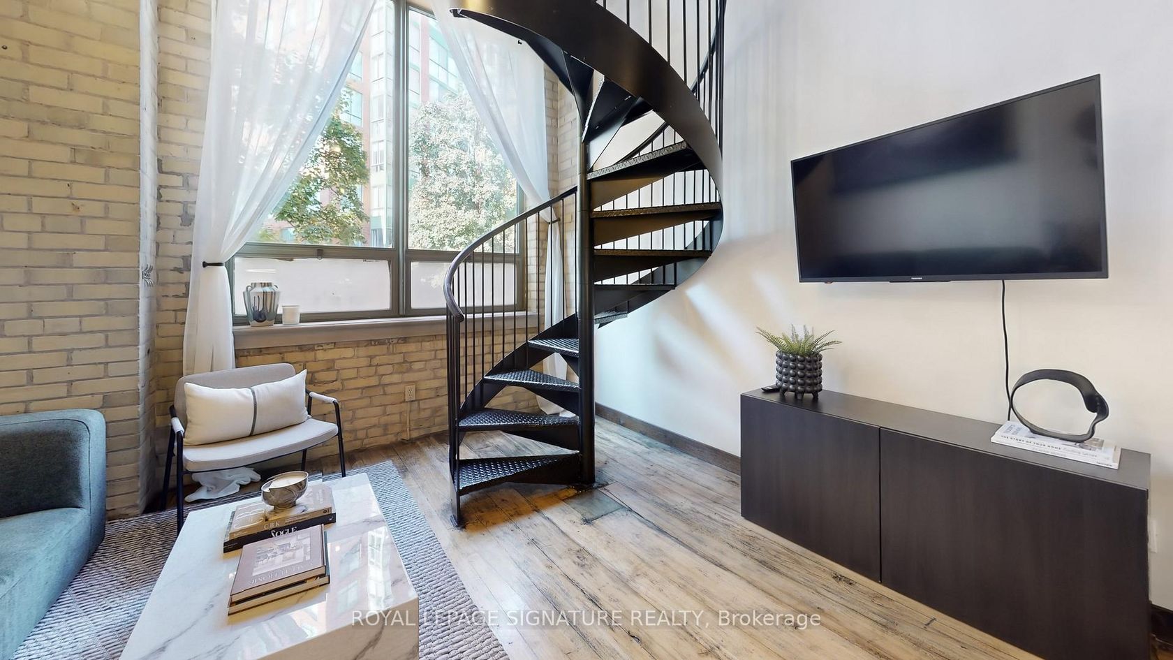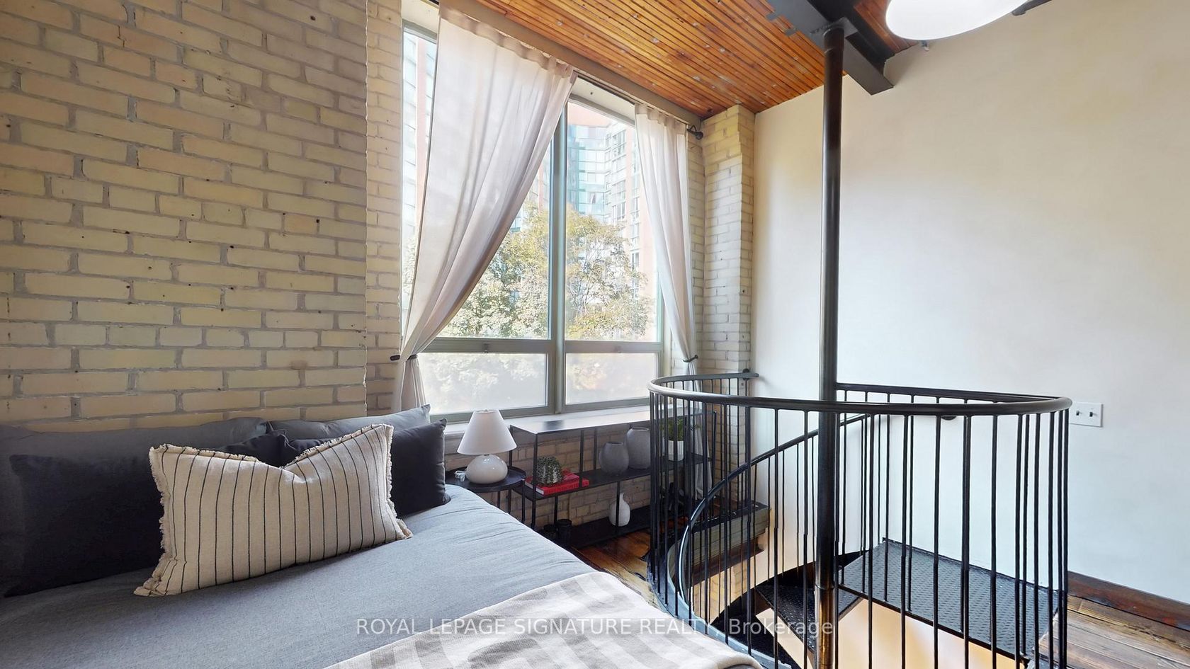 Welcome to Gotham Lofts where heritage charm meets modern design in the heart of King West. This rare 625 sq ft 1-bedroom, 1-bath residence features soaring 11'9" post-and-beam ceilings, exposed century-old brick, and a striking steel spiral staircase that creates a dramatic focal point and stunning lime washed walls. The updated kitchen is equipped with stainless steel appliances and ample storage. Oversized west-facing windows flood the space with natural light, creating an ideal setting for both living and working. This boutique hard loft building offers amenities including a fitness centre, party room, and visitor parking. Located steps from the best of King and Queen West, Trinity Bellwoods Park, and the 504 streetcar, this is a rare opportunity to own a true hard loft in one of Torontos most desirable neighbourhoods. Includes parking and locker.