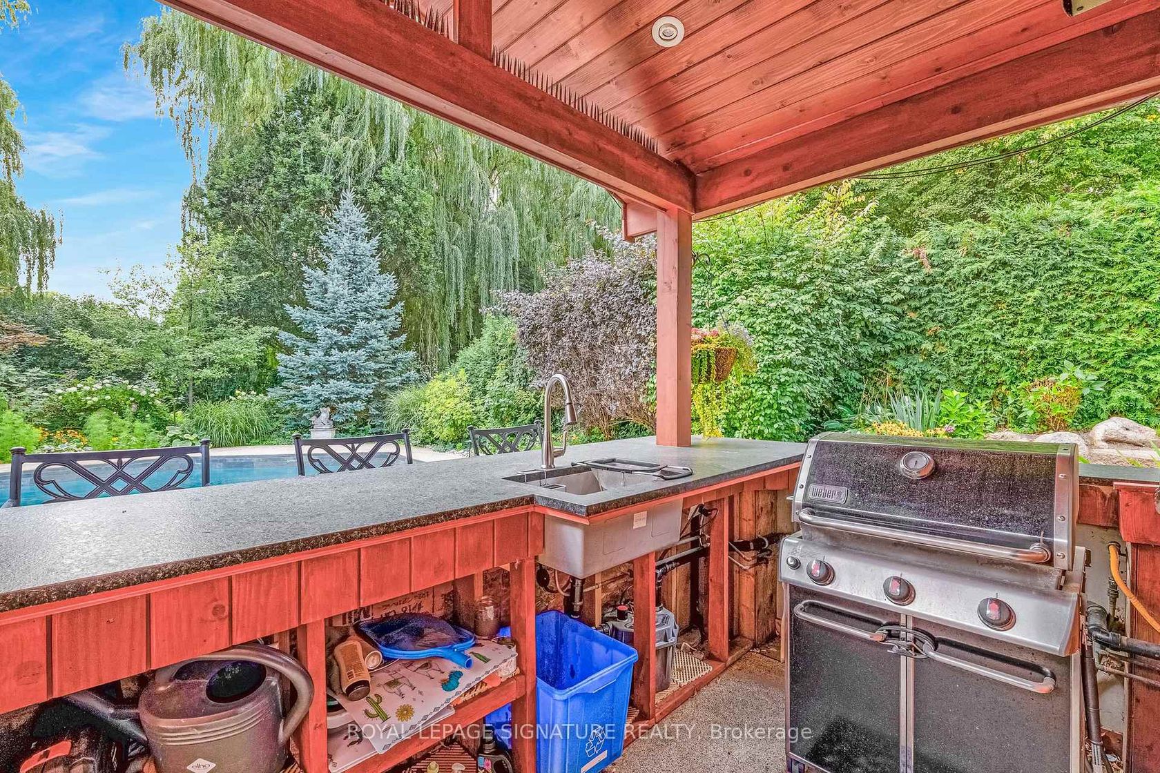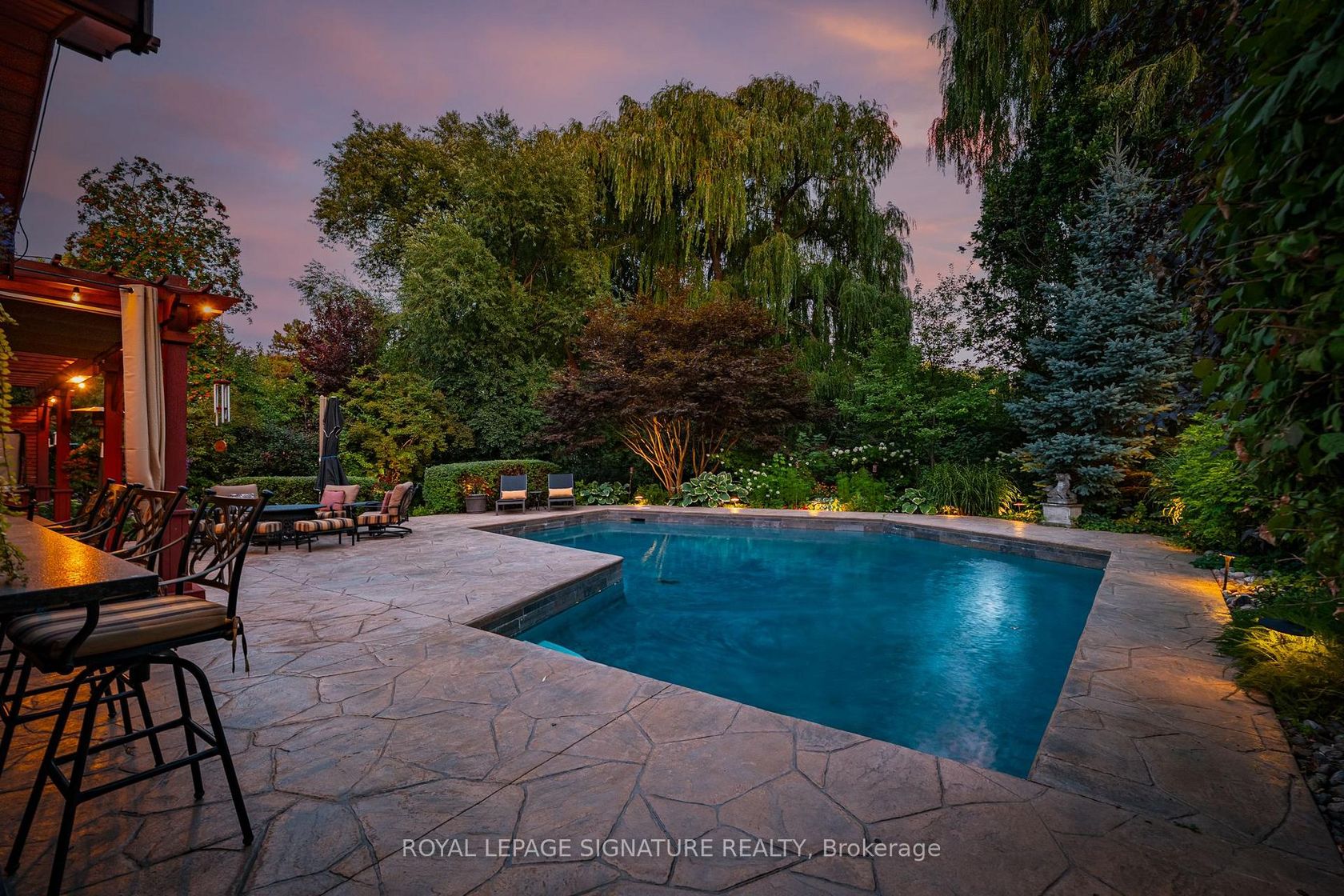 Welcome home to 41 Denver Crescent a Henry Farm Ravine Oasis. Here is your unique opportunity to live on one of Henry Farms most prestigious and tranquil streets. This stunning 4+1 bedroom home is ideal for anyone seeking a serene escape within the city. The true showstopper is the breathtaking, sun-drenched, south-facing, resort-like backyard. Backing onto a gorgeous ravine, the mature trees and lush gardens create the perfect backdrop to the Gunite pool (solar heated), hot tub, pergola, and expansive stone patio - big enough for an extra-large dining table, casual seating area, and loungers! A fully equipped cabana with a wet bar, fridge, gas BBQ, and TV makes entertaining effortless. Every inch of this beautifully landscaped backyard has been thoughtfully designed for relaxation, luxury, and enjoyment. By night, the landscape glows with thoughtfully placed lighting, turning every evening into something magical. Behind the pool is a hidden lower-level grassy area that is perfect for a playset, soccer practice, or even a putting green! The open concept main floor features hardwood throughout, an updated kitchen with quartz counters, breakfast bar, and tons of storage! The elegant living room/dining area seamlessly accommodates gatherings of all sizes. Upstairs, you'll find three bedrooms with lots of closet space. The basement is fully finished with a rec room, cozy bedroom with a fireplace, and lots of storage. On ground level, you'll find a large office (or bedroom) with built-ins and a 28-ft family room with a walk-out to your own private backyard oasis. Double car garage plus parking for 4 cars in the driveway. Henry Farm is one of the most engaged communities you'll find in the city. Community newsletter, events, local school, tennis club, church, neighbourhood watch, all make this community unique. Just steps to transit, GO train, subway, North York General Hospital, Fairview Mall, grocery stores, and the Don Valley trails. Minutes to both 401 and DVP.