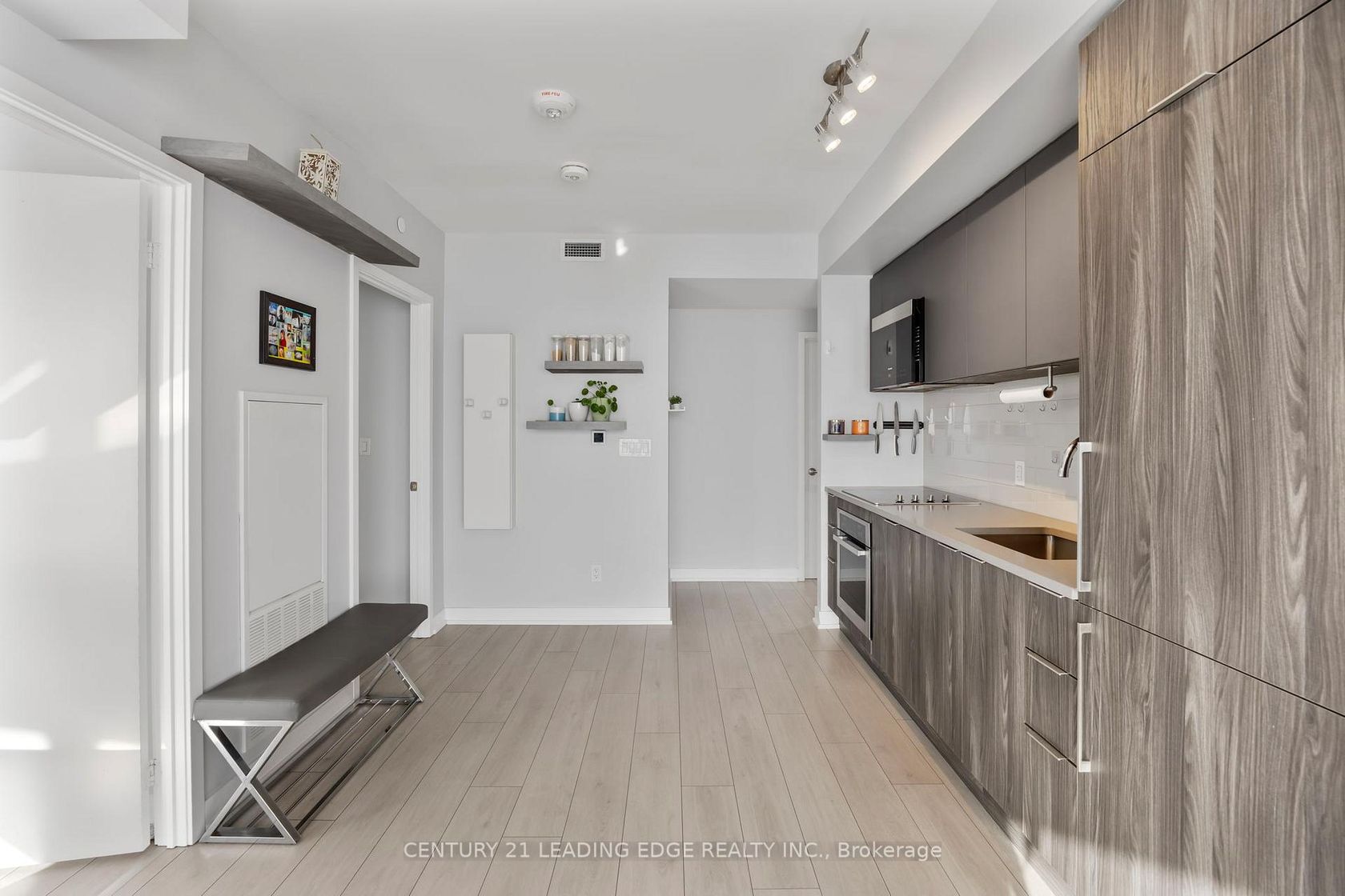 Modern 2 bedroom condo. Ideal for first time buyers. Unobstructed view, 2 baths, ensuite laundry, wrap around balcony, floor to ceiling windows, quality laminate floors thoroughout, w/o from living and bedroom to balcony. Stunning grand lobby, sport lounge, yoga room, exercise room, outdoor terrace with BBQ facilities. Minutes to HWY 401, steps to TTC, shopping, parks, and other amenities. All existing appliances, (fridge, stove, b/i microwave, washer and dryer) Electrical light fixtures and one parking spot.