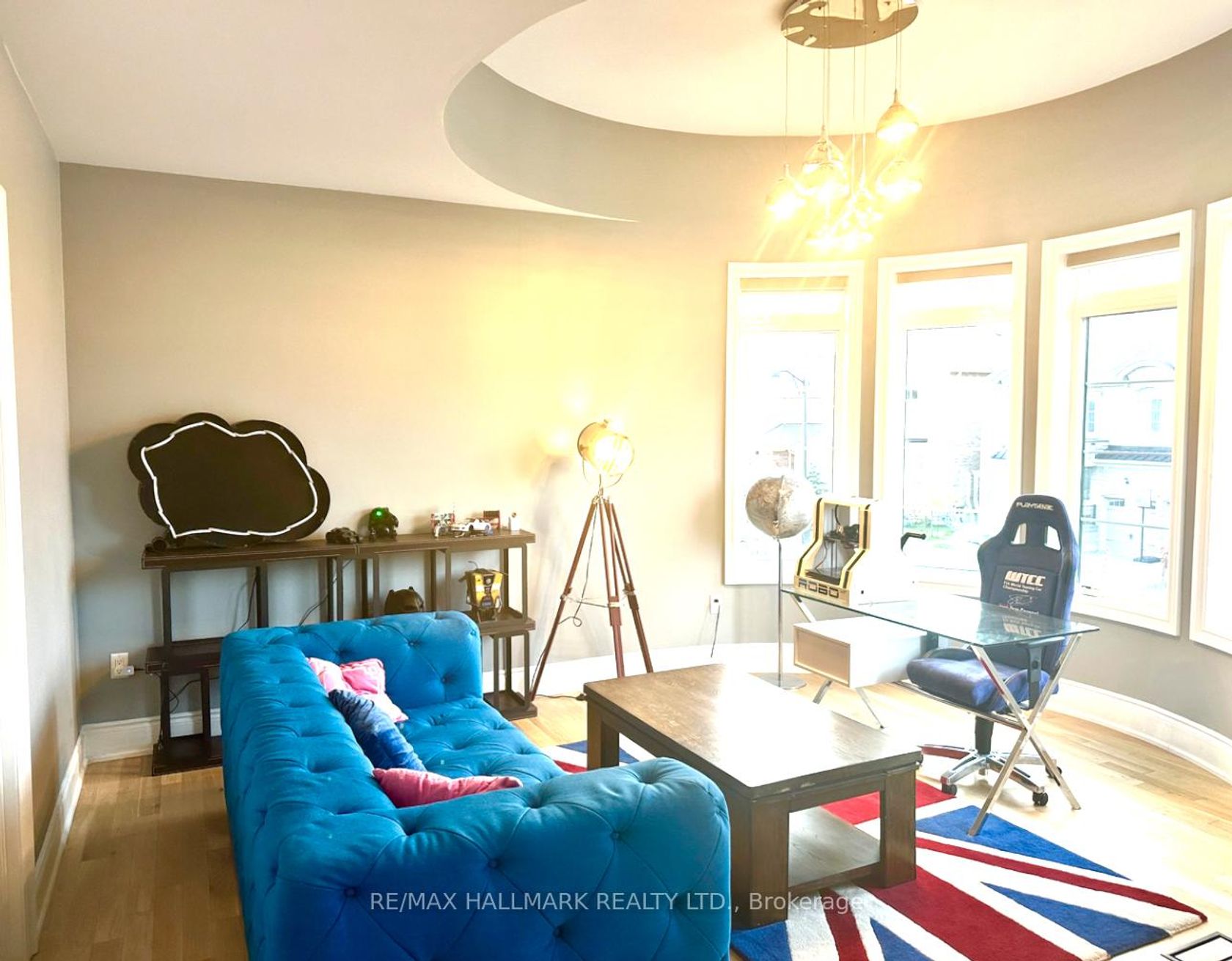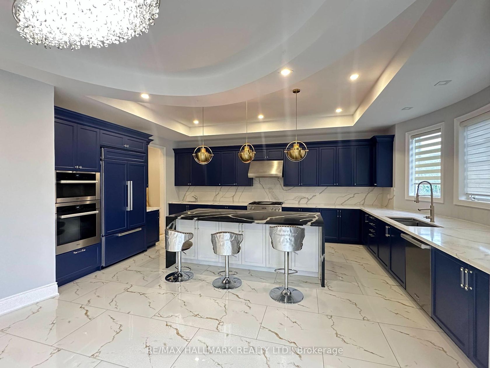 This stunning residence offers approximately 5,000 sq. ft. of luxurious living space with a rare tandem 3-car garage. The grand main floor features a soaring 21-ft hallway, elegant hardwood flooring throughout, and brand-new hardwood on the second level. Designed with 11-ft coffered ceilings, the home boasts a chef-inspired kitchen with a striking two-tone quartz waterfall island, a spacious formal dining room, a bright living room, a cozy family room with a gas fireplace, laundry on main, and a stylish powder room. Upstairs, 10-ft ceilings enhance the sense of space. Four generously sized bedrooms each include a private ensuite and walk-in closet, complemented by a media room that can easily serve as a fifth bedroom. The spa-like master retreat showcases a sun-filled half-circle sitting area, walk-in closet, and a luxurious ensuite with frameless glass showers.6 Burner Gas Miele Stove, Miele Oven, Fridge, Miele Dishwasher, Front Load Washer And Dryer. Custom Window Coverings And Luxury Light Fixtures, Security System, Interlocking Brick Drive.