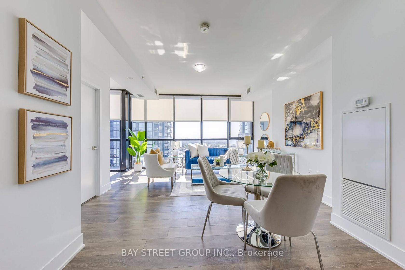 Stunning corner suite featuring 2 spacious bedrooms plus a den and 2 full bathrooms in the heart of Vaughan Metropolitan Centre. This modern, sun-filled unit offers 851 sqft of functional open-concept living space with 9 ft ceilings and floor-to-ceiling windows showcasing unobstructed southeast views. Enjoy a large primary bedroom with a private ensuite, sleek laminate flooring throughout, and a bright combined living/dining area. Unbeatable location steps to subway, shops, restaurants, groceries, and minutes to Hwys 400 & 407, York University, and more. Premium amenities include an indoor pool, gym, party room, games/library room, movie theatre, concierge.