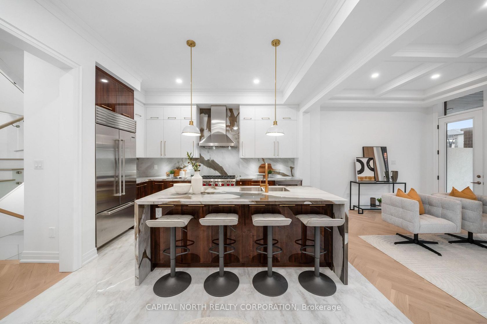 Welcome To 4B McCachen Street, A Stunning 2,500 Sq. Ft. Luxury Home Designed For Those Who Appreciate Refined Craftsmanship And Modern Elegance. This Residence Boasts Herringbone Hardwood Floors, Imported Italian 24" X 48" Tiles and 8' Doors Throughout For A Grand Aesthetic. The Custom Kitchen Features Bookmatched Woodgrain Cabinetry, Brushed Gold Hardware, Extended Upper Cabinets, Soft-Close Drawers, Built-In Spice Racks And Is Equipped With Sub-Zero & Wolf Appliances. Imported Italian Countertops, A Waterfall Island And A Full-Height Backsplash Add A Sleek Touch. The Family Room's Waffle Ceiling, Feature Wall And 60 Linear Fireplace Create A Warm Yet Sophisticated Ambiance, Complemented By Crown Moulding And Wainscoting Throughout. Bathrooms Are Outfitted With Imported Brushed Gold Plumbing Fixtures, Backlit LED Mirrors And Designer Finishes. Over 100 Pot Lights And Elegant Pendant Lighting Enhance The Homes Ambiance. The Finished Basement Offers Additional Living Space, While A Control 4 Smart Home System With Ring Doorbell Ensures Convenience And Security. The Primary Suite Features A Custom Closet Organizer, Making Every Detail Of This Home Both Stylish And Functional.