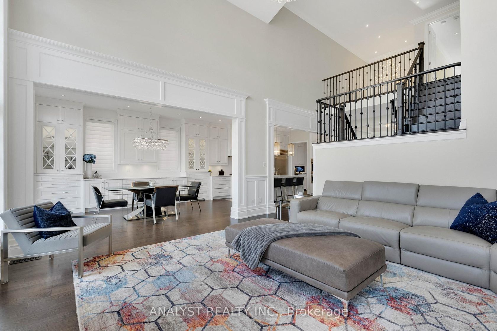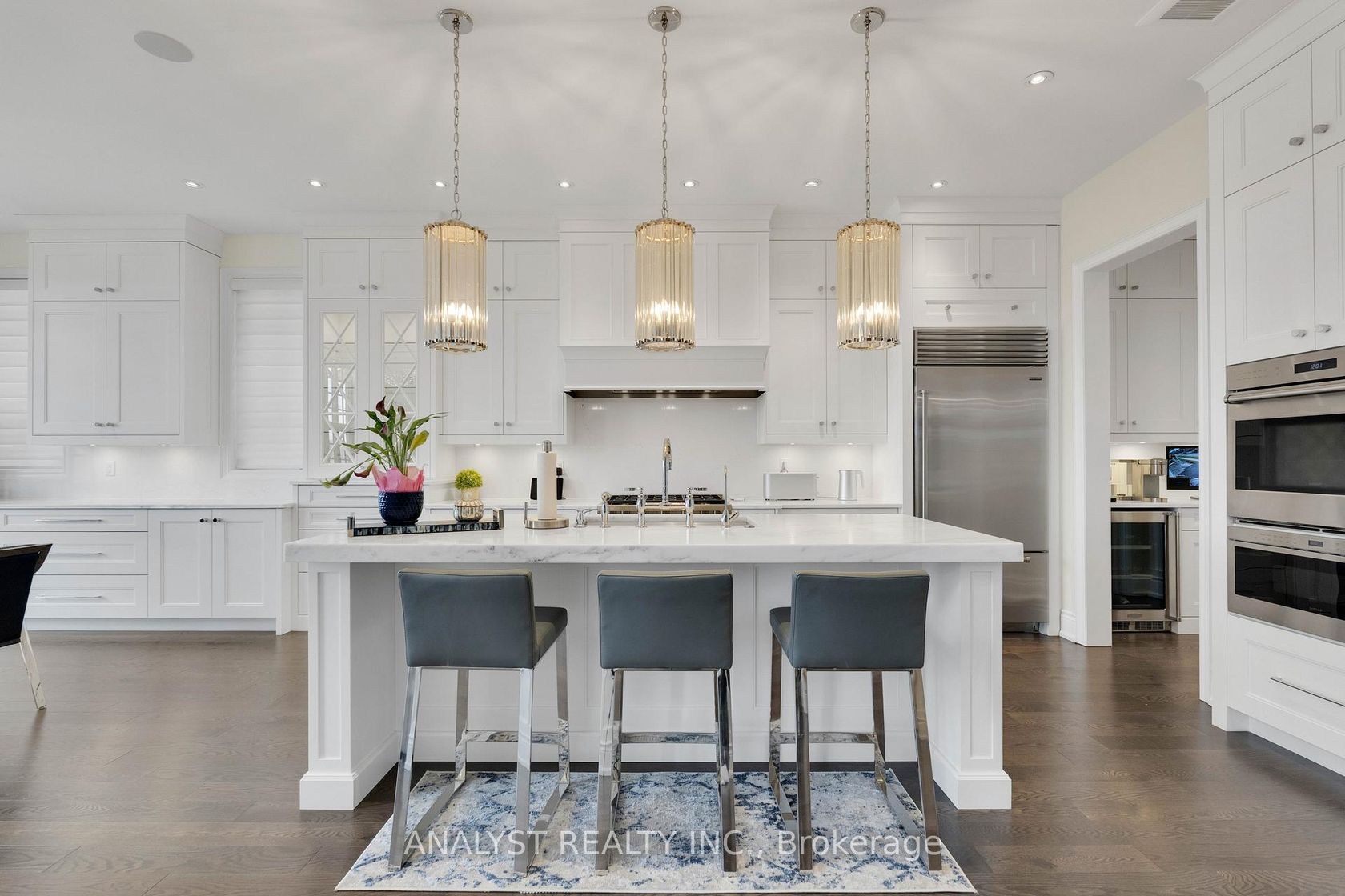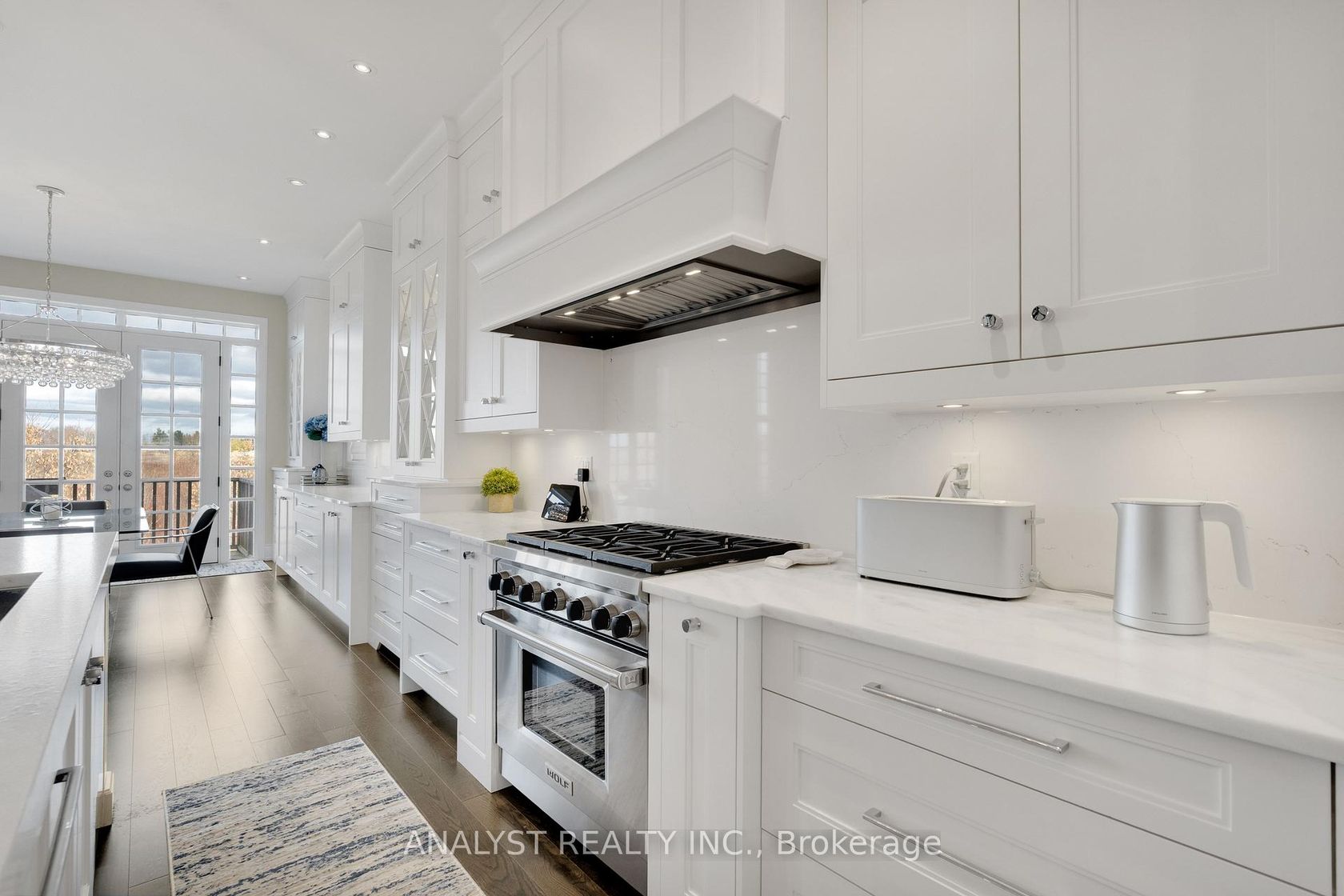 Exceptional luxury bungaloft offering over 7,000 sq.ft. of finished living space on an exclusive court of only five homes, backing onto a protected ravine and the Oak Ridges Moraine for unmatched privacy and scenic views. This residence features a fully upgraded stone façade, enhanced window mullions, smart-home controls, exterior lighting, and a three-car garage with epoxy floors, storage loft, and EV charging outlet.The main floor showcases soaring ceilings, extensive pot lights, wide-plank hardwood flooring, upgraded trim and headers, 11" baseboards, custom crown moulding, and designer wainscoting. The grand foyer opens to elegant living and dining spaces finished with refined millwork, Hunter Douglas window coverings, upgraded chandeliers, and built-in ceiling speakers. The opulent chef's kitchen offers custom cabinetry with built-in organizers, two pantries, soft-close systems, Carrara leathered marble counters, a large centre island, Kohler professional fixtures, reverse osmosis filtration, Asko dishwasher, Wolf appliances, Sub-Zero refrigeration, and a separate servery with walk-in pantry and wine fridge. The breakfast area opens to a deck overlooking the ravine, while the dramatic family room highlights a limestone fireplace, oversized Muskoka-style windows, and an open-to-above design.The primary suite features vaulted ceilings, a bay window with bench seating, an organized walk-in closet, motorized blinds, and a luxurious 5-piece ensuite. The second level offers three additional bedrooms with walk-in closets, ensuites or semi-ensuites, and a loft/media area. The above-grade walkout basement is fully finished with 9' ceilings, oversized windows, a family and games area, gym, office space, entertainers' kitchen with Caesarstone waterfall island, fireplace, 3-piece bath, workshop, and cold room. new Lennox furnace (2024), tankless water heater, water softener, air exchanger, upgraded windows, cvac, oak staircase, iron pickets, and full home surveillance