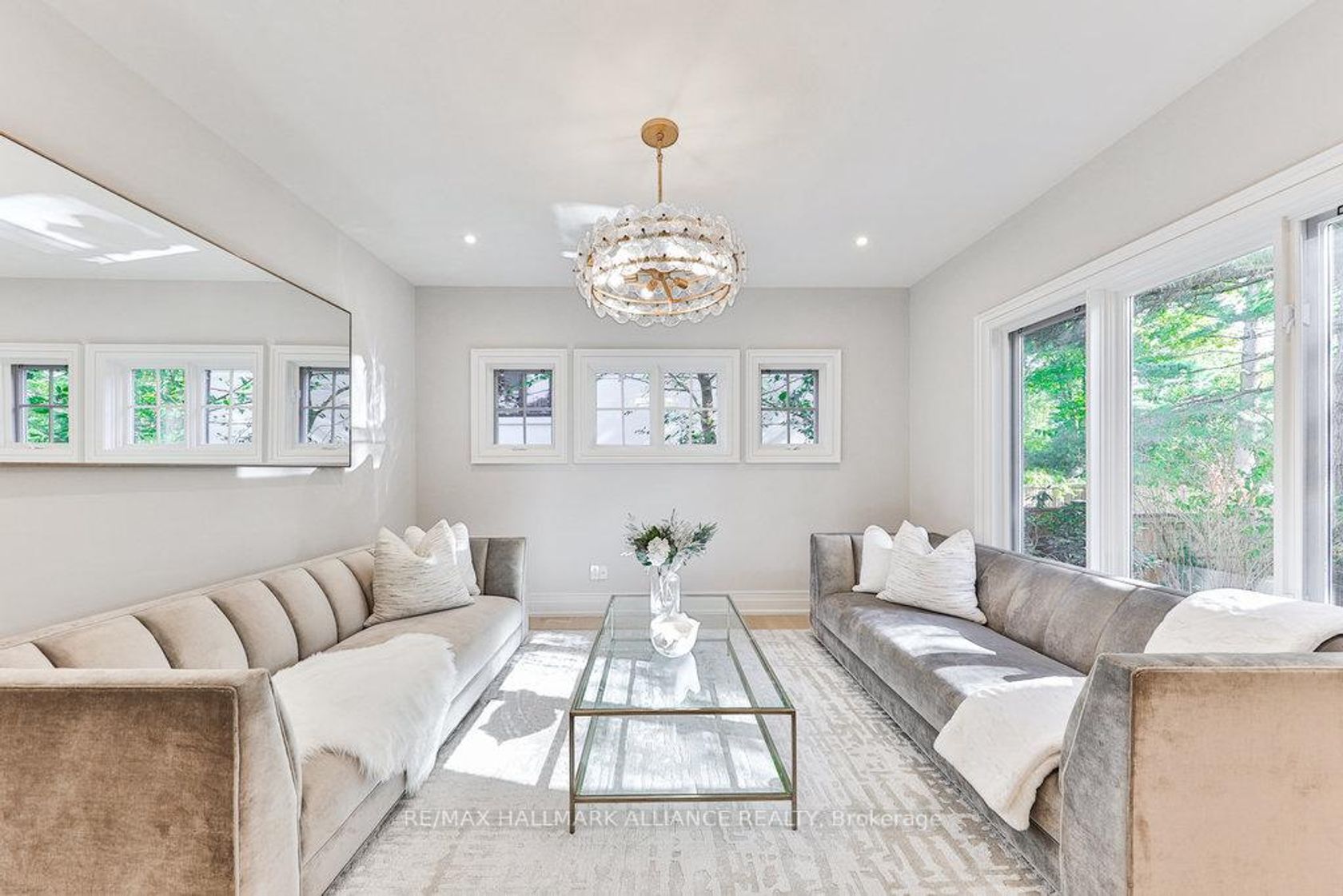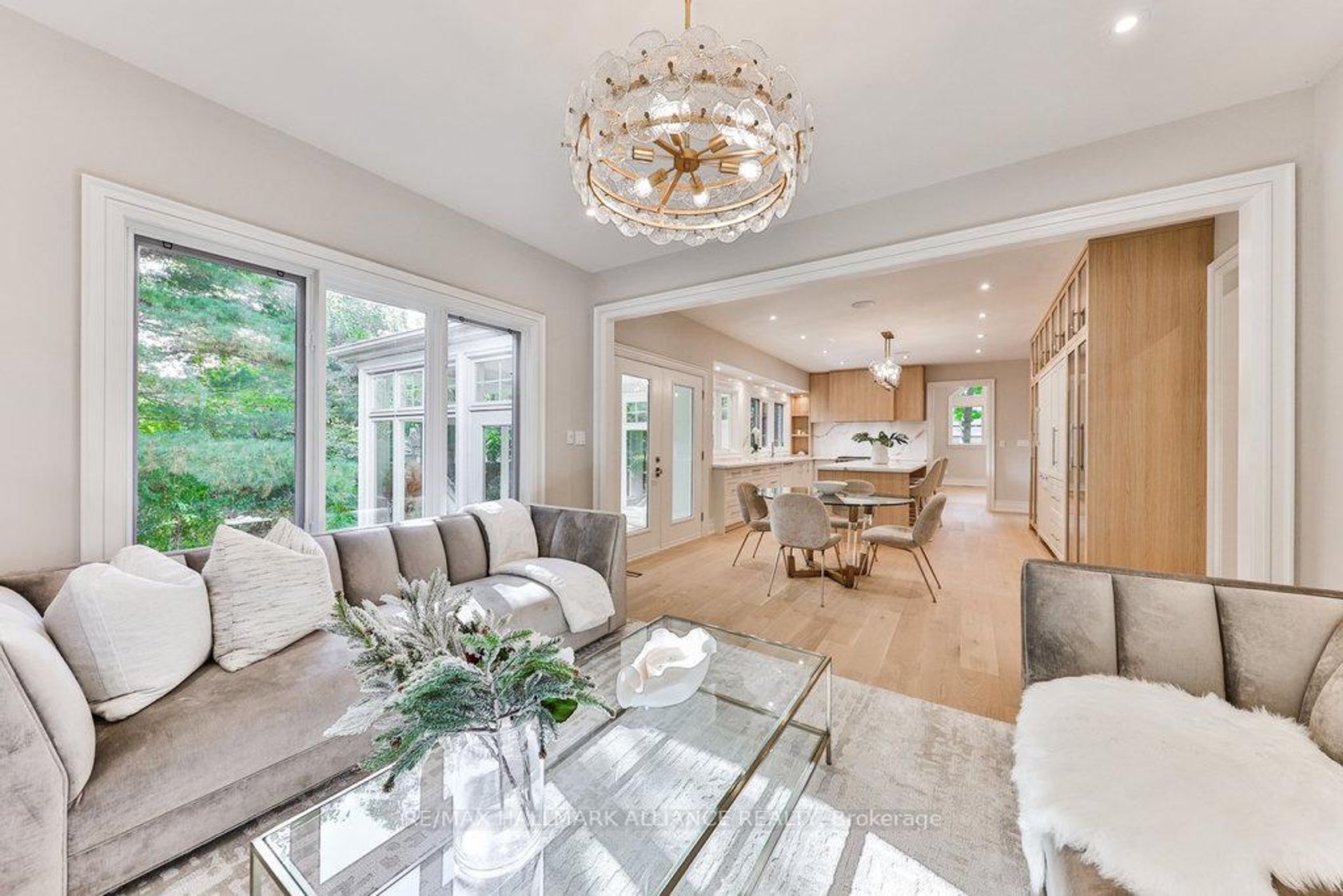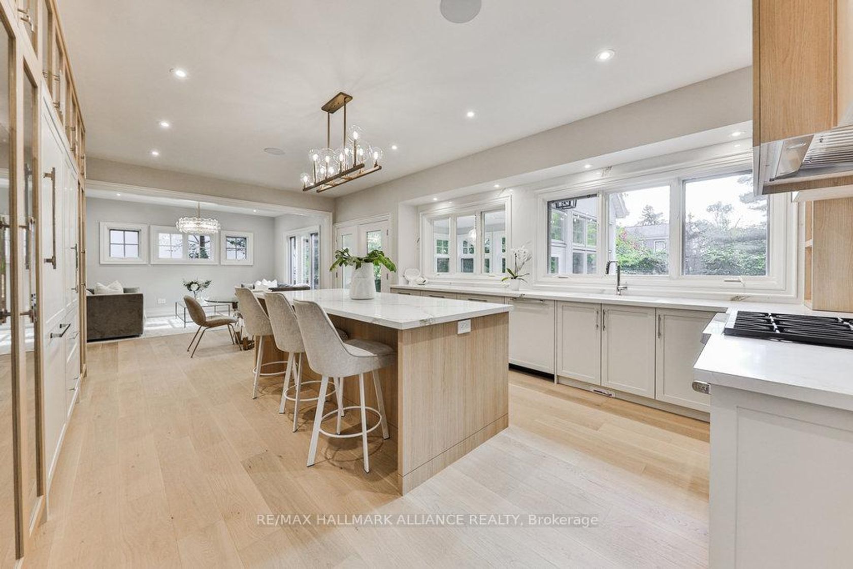 This spectacular residence has been completely renovated to the studs with high-end finishes and a thoughtfully reimagined floor plan, blending timeless elegance with modern functionality. Situated on a premium 75x150 south-facing rectangular premium lot, this home is just a short walk to Oakville's top-rated schools.The exterior showcases new stucco with natural stone accents, oversized windows, and stunning curb appeal. Inside, the open-concept design features a grand living/dining room with soaring 13-ft ceilings and wood-burning fireplace, seamlessly flowing into a brand-new custom kitchen and family room. The chefs kitchen offers a massive center island, custom hardwood cabinetry, top-of-the-line appliances including a Wolf stove and Fisher & Paykel fridge, and walkout to a sun-filled cedar deck. A beautiful sunroom with full HVAC brings the outdoors in, overlooking landscaped gardens, mature trees, ponds, and stone pathways. The upper level features double primary suites with spa-inspired ensuites, heated floors, and walk-in closets, providing exceptional comfort and flexibility for families. Designer details throughout include custom millwork, accent lighting, hardware, California shutters, and premium hardwood flooring. The fully finished lower level offers a nanny/in-law suite with in-floor heating, recreation space, and plenty of storage. Recent upgrades include new spray foam insulation, new electrical panel, sump pump, tankless hot water system, pot lights, built-in speakers, and luxury designer tiles in all bathrooms. This one-of-a-kind home is the perfect blend of modern luxury, refined craftsmanship, and family-friendly living, a rare offering in one of Oakville's most prestigious neighbourhoods.