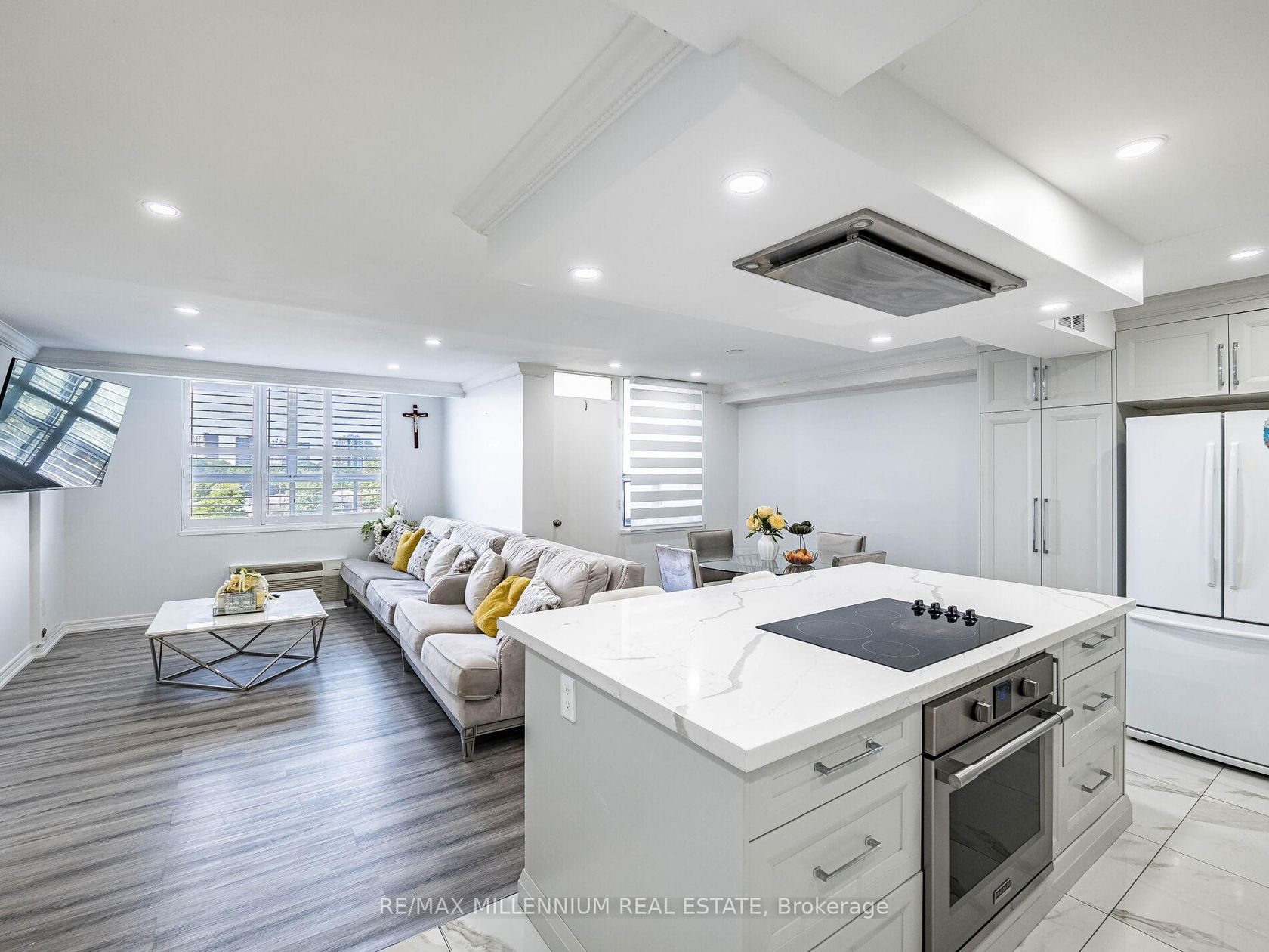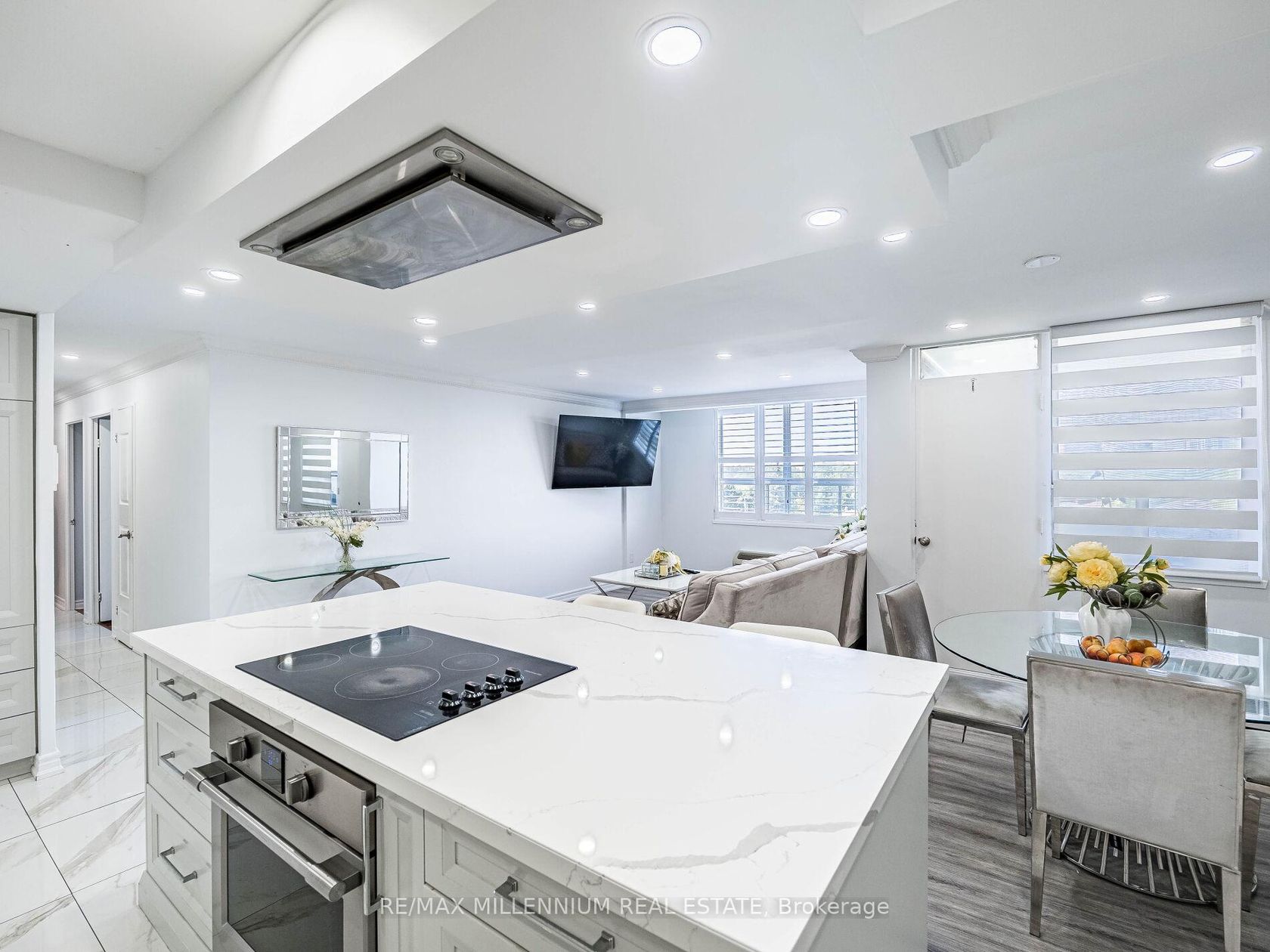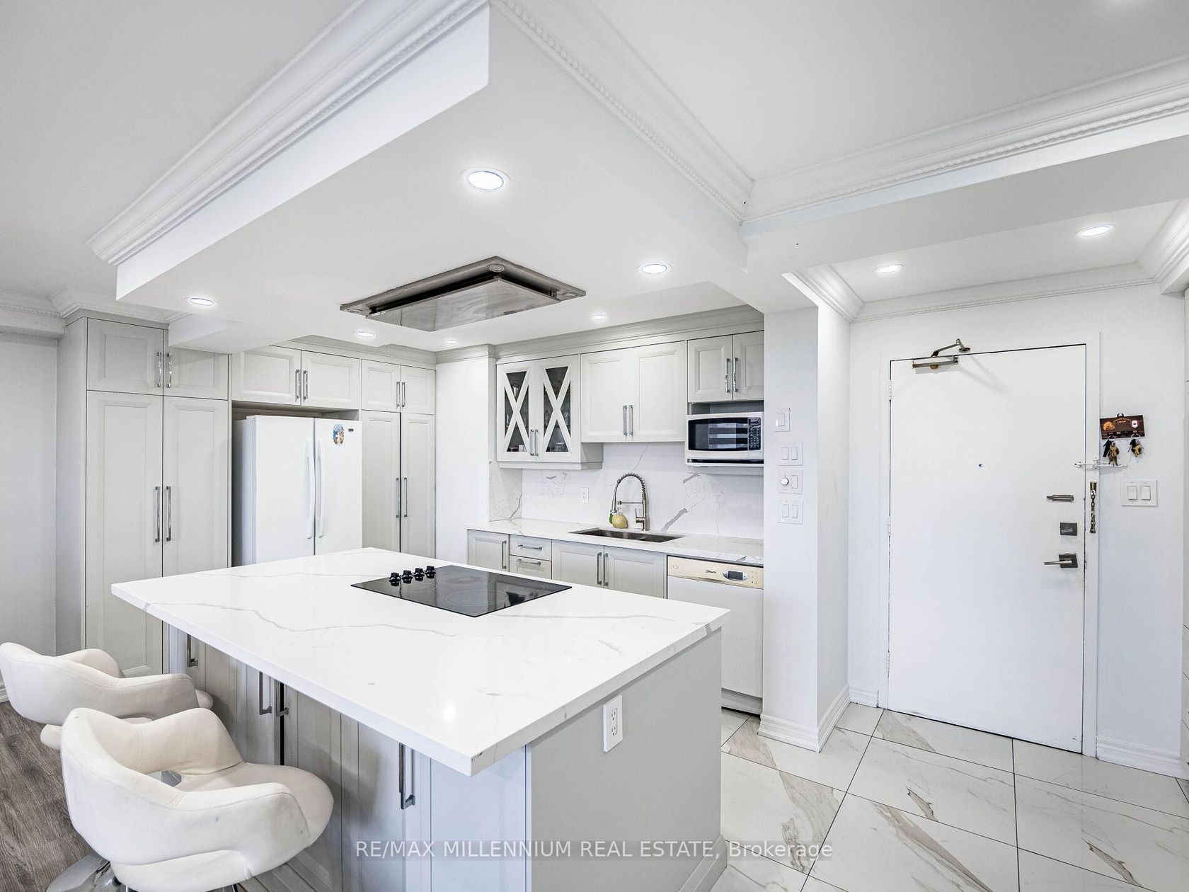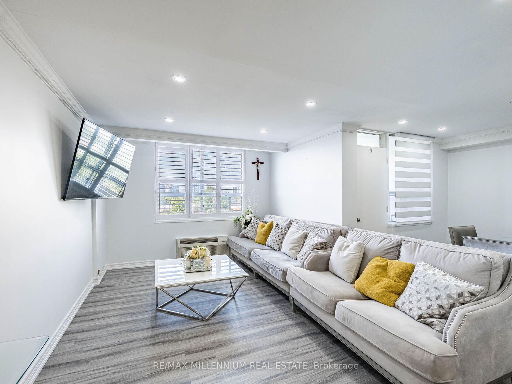 Fully Renovated 3-Bedroom, 2-Bath Swiss Court Condo 1,220 Sq Ft! Stunning upgrades throughout: NEW! modern kitchen with quartz counters, matching backsplash, & center island; custom built-in bedroom closets; renovated tiled baths; crown moulding & pot lights. Spacious open-concept living/dining with walk-out to balcony. Well-managed building with indoor pool, sauna, & secure parking. Fees include water, cable, insurance, & parking. Steps to TTC, parks, schools, shopping & Hwy 400. Move-in ready!