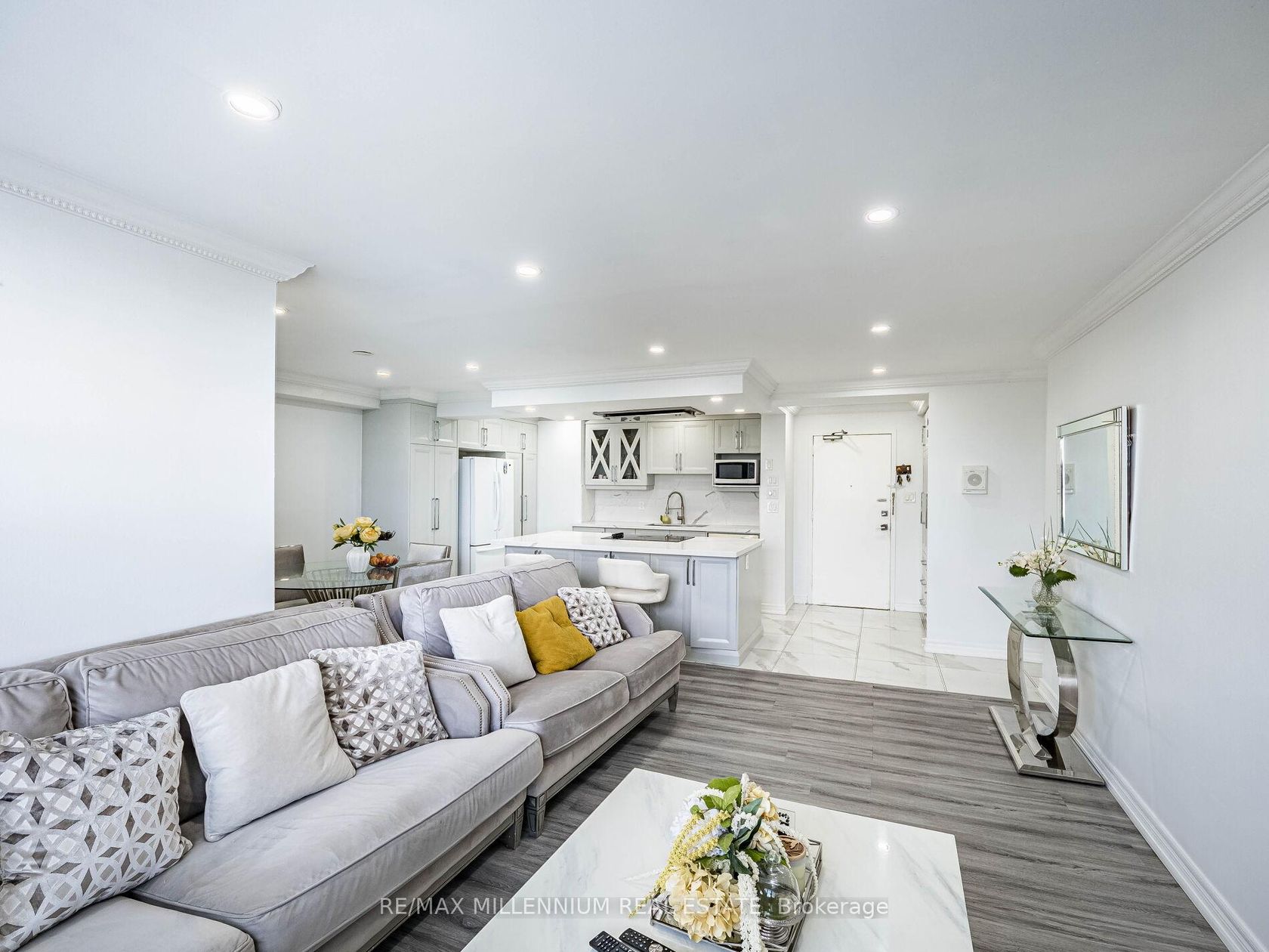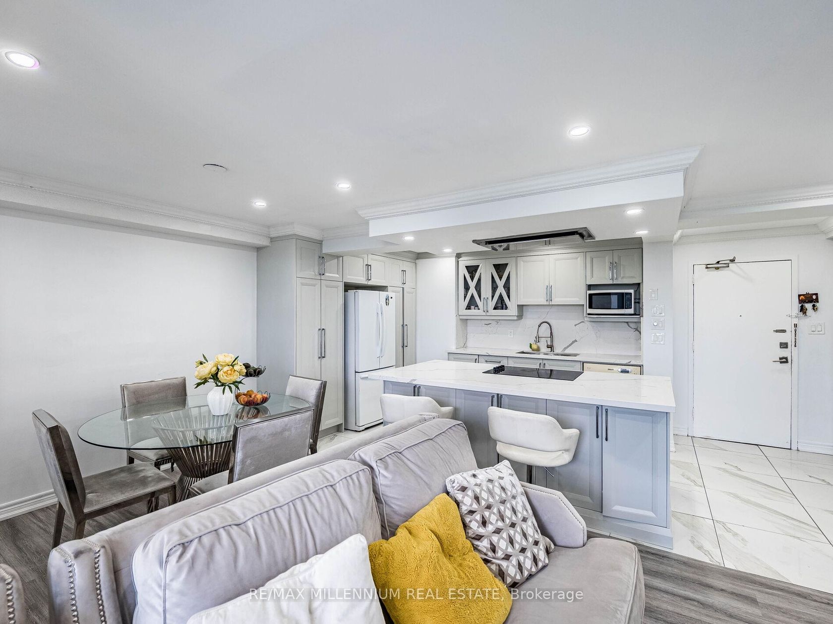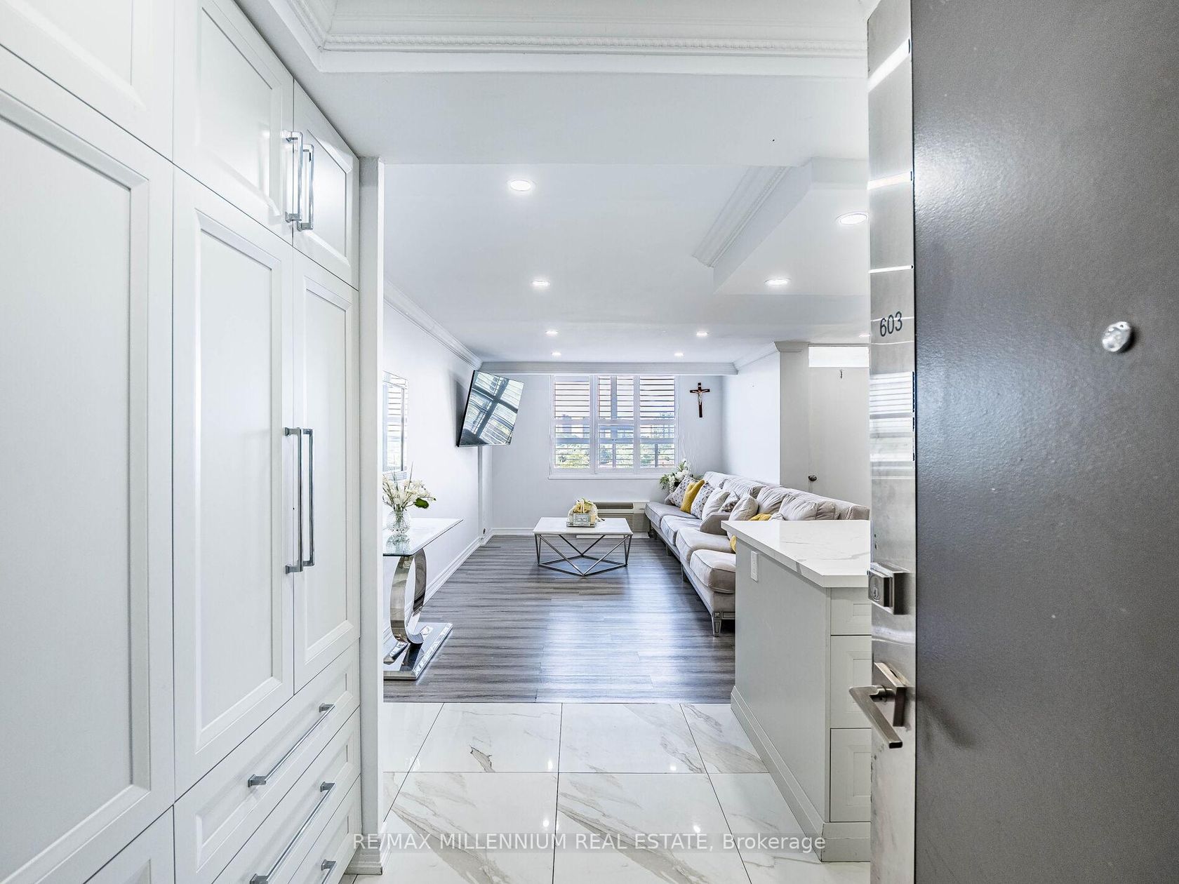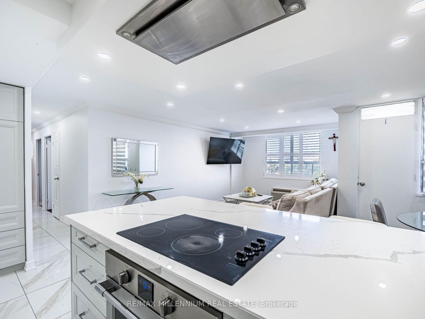 Fully Renovated 3-Bedroom, 2-Bath Swiss Court Condo 1,220 Sq Ft! Stunning upgrades throughout: NEW! modern kitchen with quartz counters, matching backsplash, & center island; custom built-in bedroom closets; renovated tiled baths; crown moulding & pot lights. Spacious open-concept living/dining with walk-out to balcony. Well-managed building with indoor pool, sauna, & secure parking. Fees include water, cable, insurance, & parking. Steps to TTC, parks, schools, shopping & Hwy 400. Move-in ready!