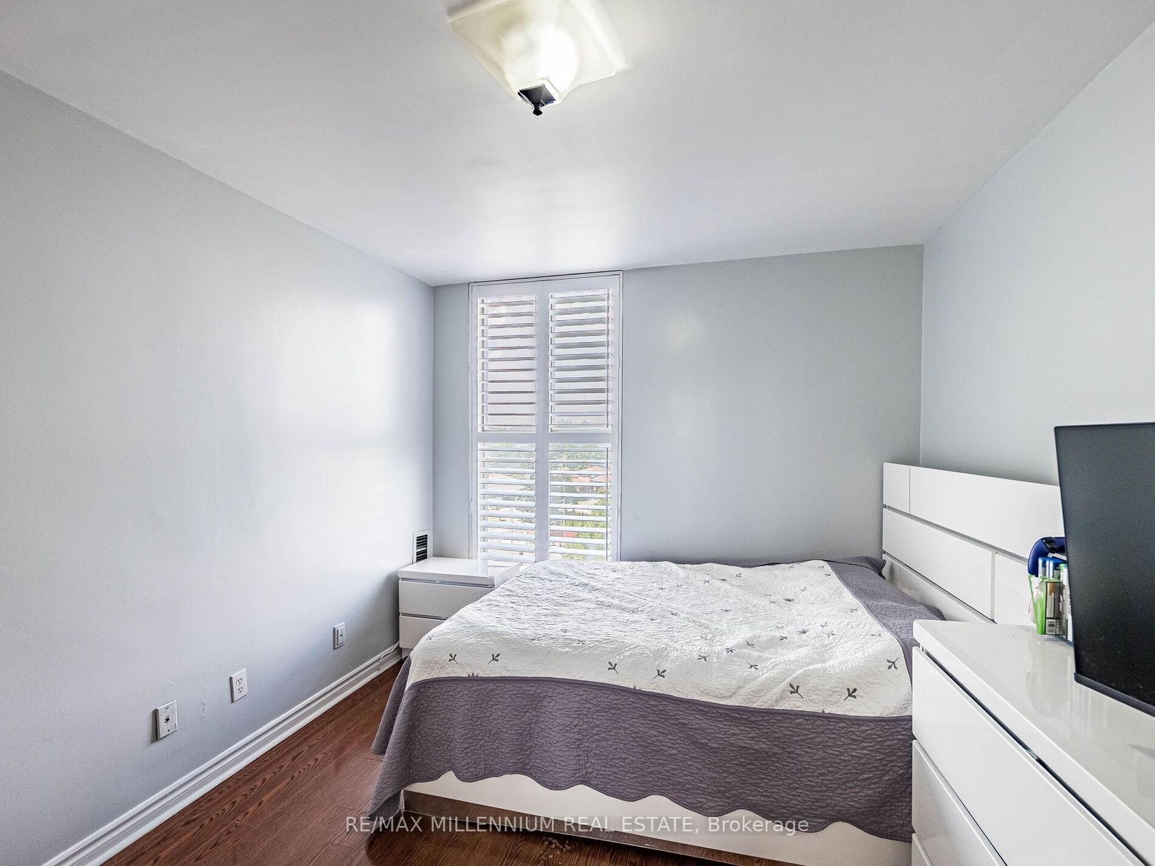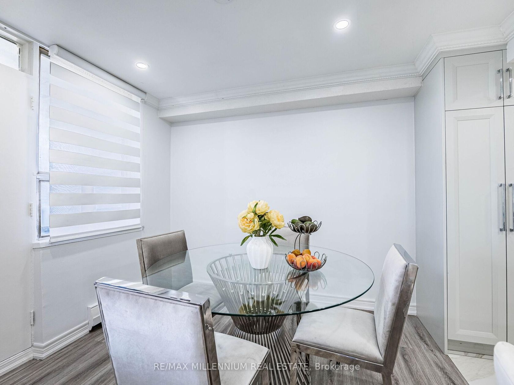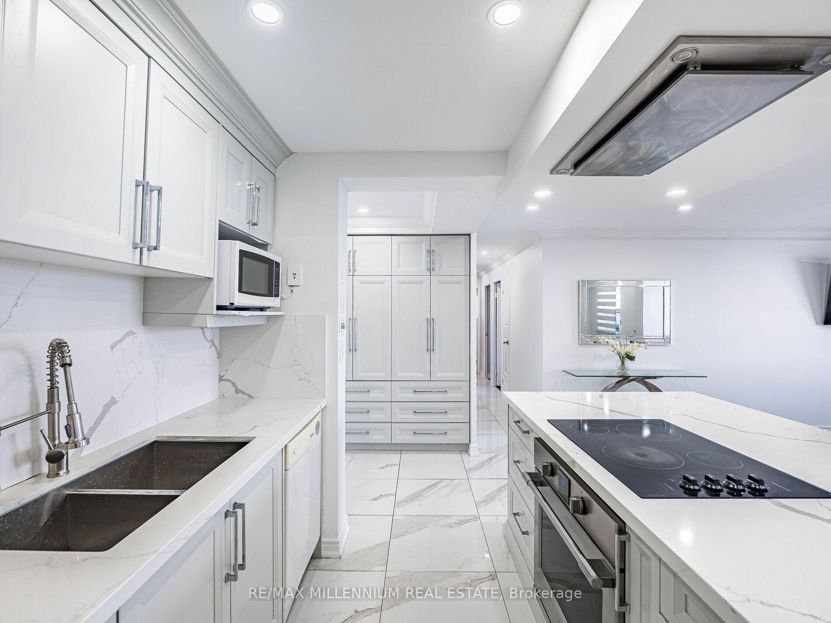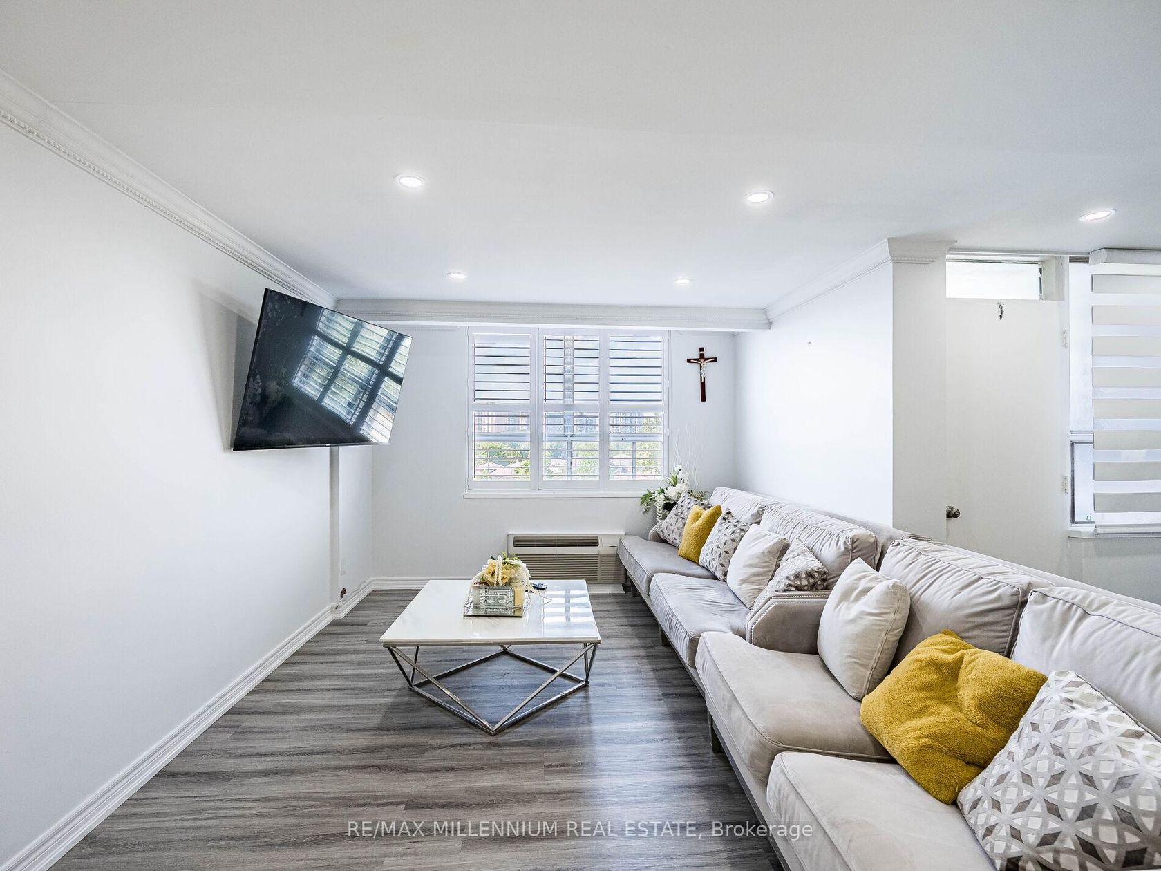 Fully Renovated 3-Bedroom, 2-Bath Swiss Court Condo 1,220 Sq Ft! Stunning upgrades throughout: NEW! modern kitchen with quartz counters, matching backsplash, & center island; custom built-in bedroom closets; renovated tiled baths; crown moulding & pot lights. Spacious open-concept living/dining with walk-out to balcony. Well-managed building with indoor pool, sauna, & secure parking. Fees include water, cable, insurance, & parking. Steps to TTC, parks, schools, shopping & Hwy 400. Move-in ready!