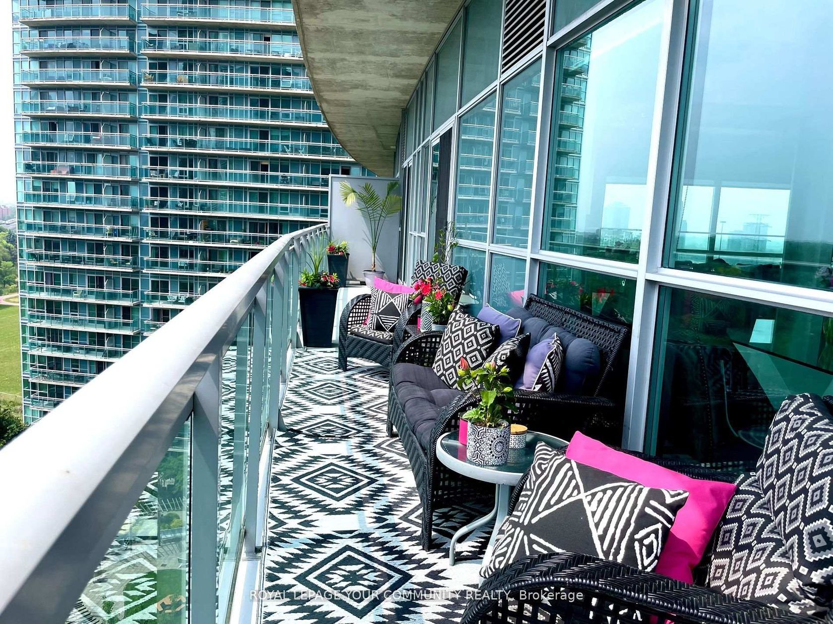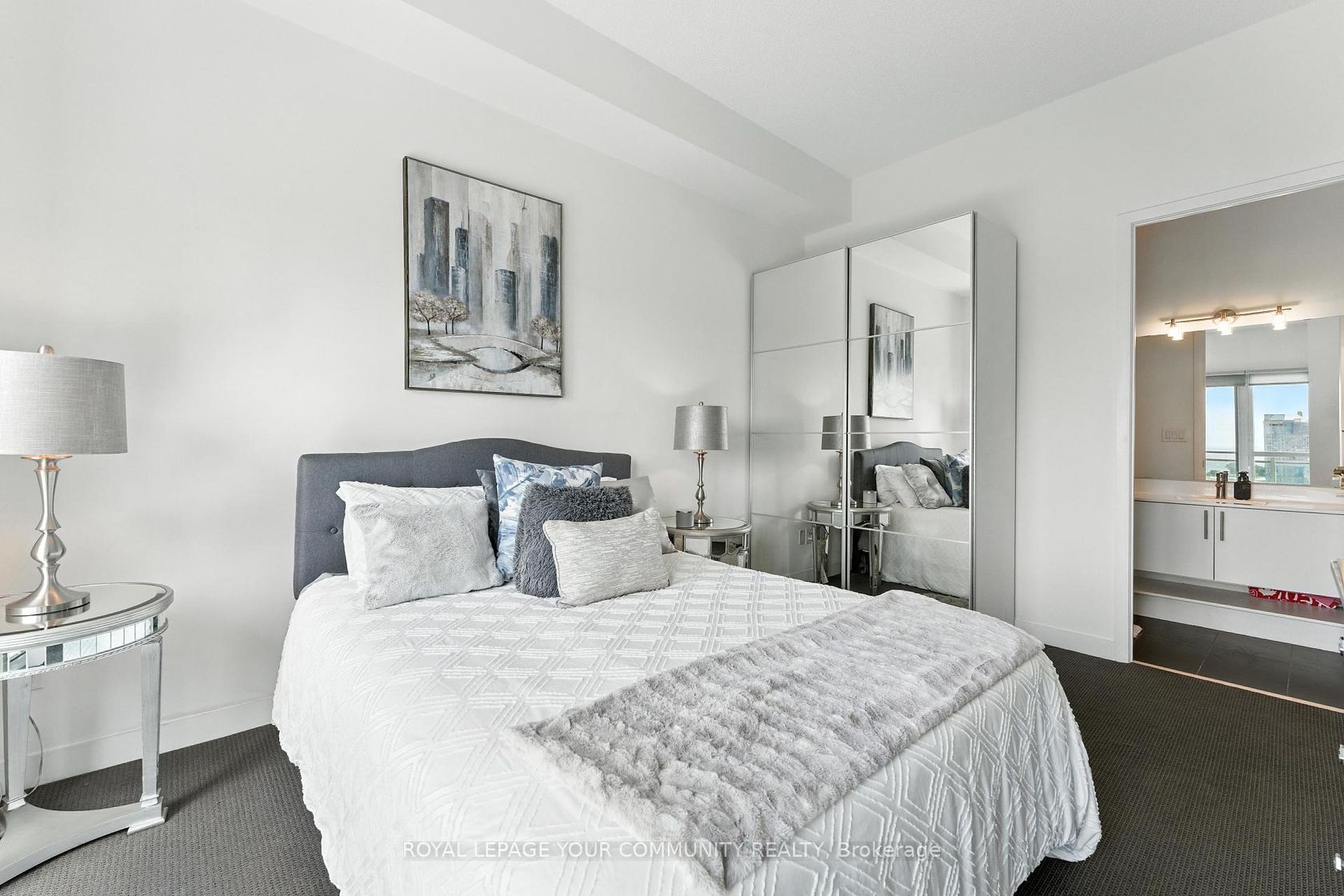 Enjoy Resort-Style living in the City; elegant and impressive 2 bedroom, 2 bathroom corner suite featuring lofty 10 ft ceilings and 975 square feet of beautifully designed space . This Condo offers an expansive open-concept kitchen, living and dining area which includes a large mirrored credenza - perfect for entertaining; walk-out to oversized (199 square ft) balcony and take in the fabulous south-east panoramic cityscape and Lake Ontario view - luxury living on Toronto's vibrant waterfront! The primary bedroom, which can accommodate a king size bed, has a terrific walk-in closet as well as a large lovely custom mirrored closet! Both bedrooms have walkouts to the balcony, each showcasing stunning unobstructed lake views; 2 Large Lockers included with this unit; Residents enjoy access to World-Class Amenities including a rare find outdoor pool, indoor pool, BBQ areas, 2 gyms with one located on the roof-top; yoga/fitness studio offering free classes; 3 hot tubs, 2 saunas, Badminton/Volley Ball Court; theatre room; billiards, library, 2 lounge/party rooms with amazing lake & city views - all this just steps from shops, lakefront, parks and dining. For boaters, conveniently located near Etobicoke Yacht Club and Marinas, and just a short walk from Mimico GO Station - an easy and efficient commute to work. The new adjacent Grand Avenue Park includes a free running/walking track, soccer field, splash pad, large dog park, rental bikes, and a new playground; very close to Gardiner Expressway, QEW, Lakeshore Blvd., Sherway Gardens Shopping Centre and downtown Toronto! Unit includes 2 large, side by side lockers, a parking spot near the elevator and 2 large mirrored custom built-in storage units; 24 Hour Concierge & Security - Pet Friendly Building!