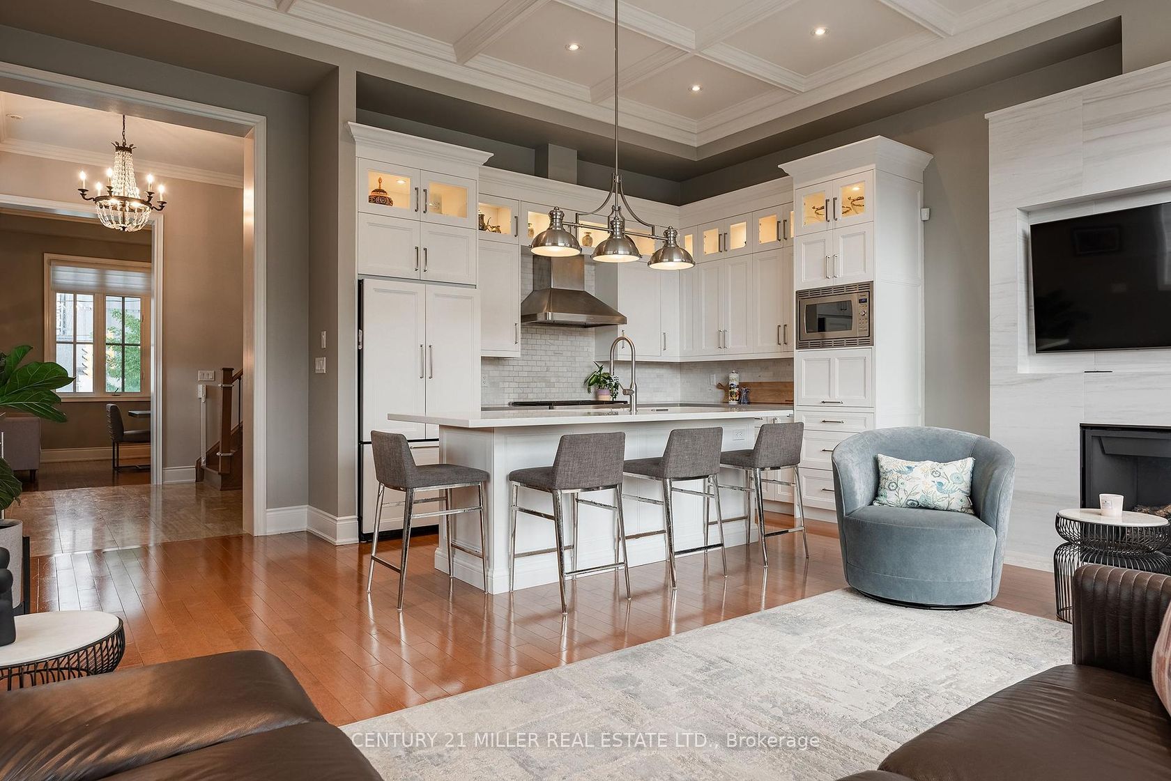 Welcome to Village West a boutique enclave of upscale freehold townhomes set in Oakvilles downtown core. This rare end-unit feels more like a New York loft than a traditional townhouse. With soaring 12-foot ceilings and loaded with huge windows throughout, the interior is defined by its sense of volume, openness, and sunlight. Where every room feels generous in scale and effortlessly connected. From the moment you step inside, youll notice the proportions: expansive principal rooms, wide hallways, tall door thresholds, and wide staircases with oversized landings. The dining room is truly grand, while the adjoining kitchen and family room are framed by a dramatic, sky-high coffered ceiling. The kitchen has been fully renovated, featuring high-end appliances, sleek finishes, and a layout designed for both everyday living and entertaining. Hardwood flooring runs throughout the home, complemented by two fireplaces and the convenience of a private elevator to every level. The double-car garage is oversized, providing not only secure parking but also ample room for storage. On the main level, a flexible office/sitting room overlooks the landscaped front and side gardens, where mature plantings and trees create privacy and a lush green outlook. On the third level, two very large bedrooms, each with its own ensuite, are generously proportioned making them a flexible space for various needs. The outdoor living is equally impressive. A 650 sq ft south-facing terrace offers a private retreat with enough room to entertain on a large scale or simply unwind in peace. The lower level extends the living space even further, perfect for a home gym, office, media room, or whatever suits your needs best. Village West is as practical as it is refined. This enclave is beautifully maintained, with a welcoming atmosphere and neighbours who take pride in their homes. All this and just steps to downtown Oakvilles shops, dining and the lakefront parks that make this location so desirable.