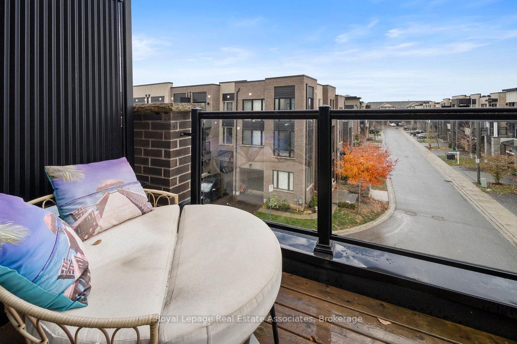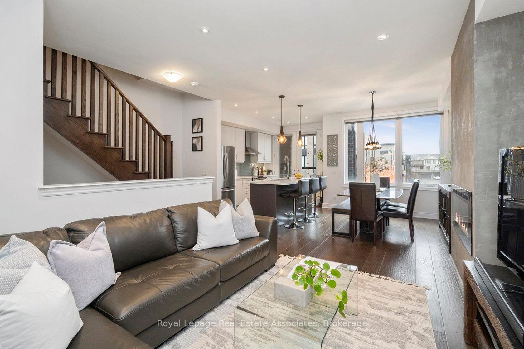 Welcome to 3076 Cascade Common, a beautifully upgraded 2-bedroom, 3-storey townhome located in Oakville's desirable Joshua Meadows community. Offering approximately 1,310 sq ft of living space plus an estimated 412 sq ft private rooftop terrace, this home is perfect for entertaining or relaxing with prime south and west-facing views. The main level features 9 ft ceilings with pot lights on dimmers and a seamless flow from the modern kitchen to the dining and living areas. The kitchen boasts stainless steel appliances, a large island with built-in sink and seating, quartz countertops, under-cabinet lighting, and a glass tile backsplash, and offers a walkout to a private balcony - ideal for morning coffee or evening unwinding. The living area is complete with an electric fireplace finished in modern concrete. Additional highlights include $47,000 in builder upgrades upon construction (2017), such as premium hand-scraped solid white oak hardwood floors with an elegant cashmere finish throughout, upgraded stairway spindles, and thoughtful design touches that elevate the home's style and comfort. The private rooftop terrace is a true retreat, featuring gas and water hookups for BBQs, outdoor dining, and gardening. Enjoy the quiet setting within walking distance to parks, shops, and local amenities. William Rose Park is just steps away, offering tennis, pickleball, baseball, splash pad, and more. Conveniently close to trails, restaurants, GO Transit, and Oakville Trafalgar Memorial Hospital. Monthly POTL fees of $64.67 cover road maintenance and garbage removal. Don't miss this opportunity to own a stylish, well-maintained home in one of Oakville's most sought-after neighbourhoods - Joshua Meadows!