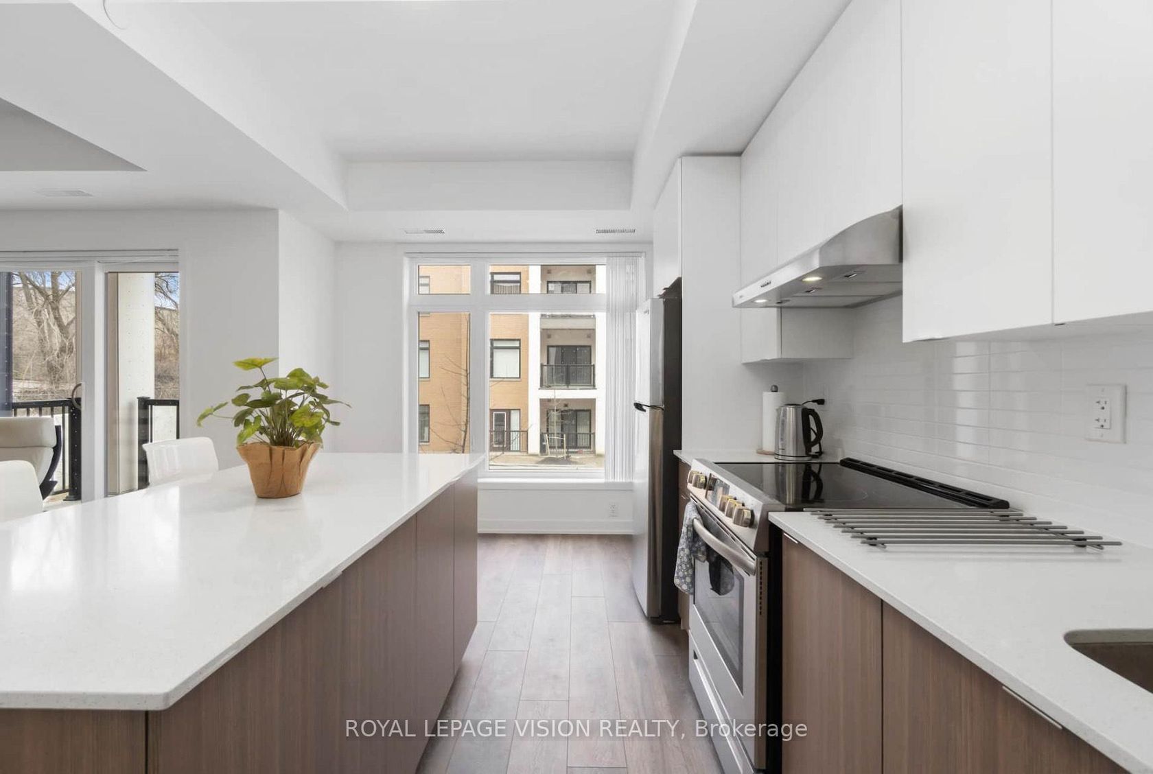 Bright and spacious 1,140 sq.ft. 3-bed, 2-bath corner suite in the heart of Keelesdale!This modern stacked townhouse features 9' ceilings, hardwood flooring throughout, a sleek quartz kitchen countertop, and a sliding glass patio door that brings in abundant natural light. Enjoy high-end finishes, a large primary bedroom, and beautifully designed modern kitchen and bathrooms.One parking space and one locker included.Conveniently located close to all amenities, shopping, TTC, and the subway.