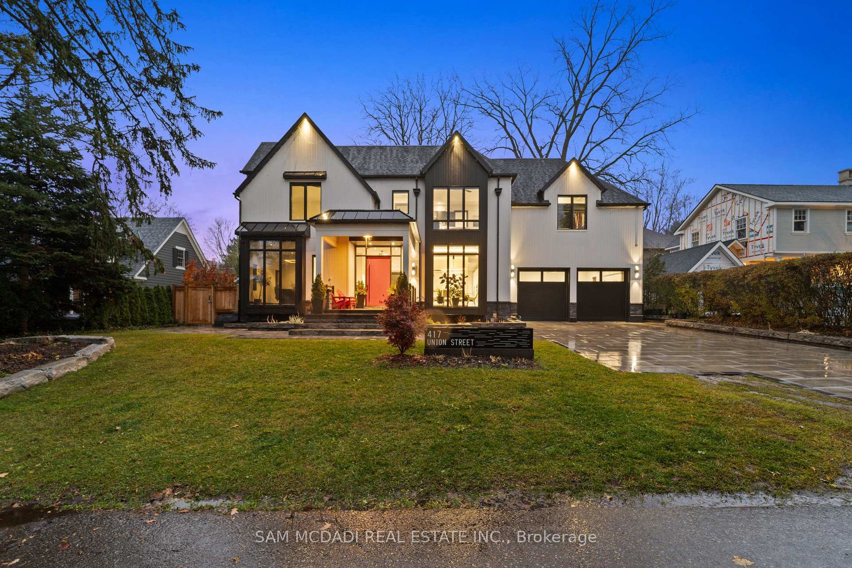 Welcome to 417 Union Street, an exceptional modern home nestled in the heart of prestigious Old Oakville. Completed in 2023, this one-of-a-kind residence blends modern farmhouse inspiration with refined contemporary and traditional design elements, creating a home that is both striking and timeless. The modern farmhouse exterior showcases clean lines, black-framed windows, and a harmonious mix of materials, complemented by a covered porch, professionally landscaped front and back yards, and a stone six-car driveway. The backyard offers a private retreat with a deck, stone patio, and custom garden shed. Inside, the home is filled with natural light and defined by a modern, sleek interior. Wide-plank engineered hardwood flooring, custom ceilings with integrated LED lighting, and large-format matte tiles elevate the main living areas. The chef-inspired kitchen features quartz countertops and backsplash, an oversized centre island, built-in Bosch appliances, and a convenient adjoining servery. A tiered maple staircase with glass railings leads to the upper level, where skylights continue the home's bright and airy feel. The expansive primary suite spans over 700 square feet and offers two walk-in closets and a luxurious five-piece ensuite with double vanity, freestanding tub, and glass-enclosed rainfall shower. Three additional bedrooms each include their own custom three-piece ensuite with modern walk-in showers. The fully finished lower level adds outstanding versatility with a second kitchen, large recreation room, two additional bedrooms with ensuites, and a powder room. Additional highlights include an elevator servicing all three levels, 10-ft ceilings on the main and lower levels, pot lights, blackout blinds, built-in speakers, and a security system. Ideally located minutes from Lake Ontario, parks, trails, Oakville GO, the QEW, and top-ranked schools including Appleby College, this home delivers modern luxury, thoughtful design, and an exceptional lifestyle.